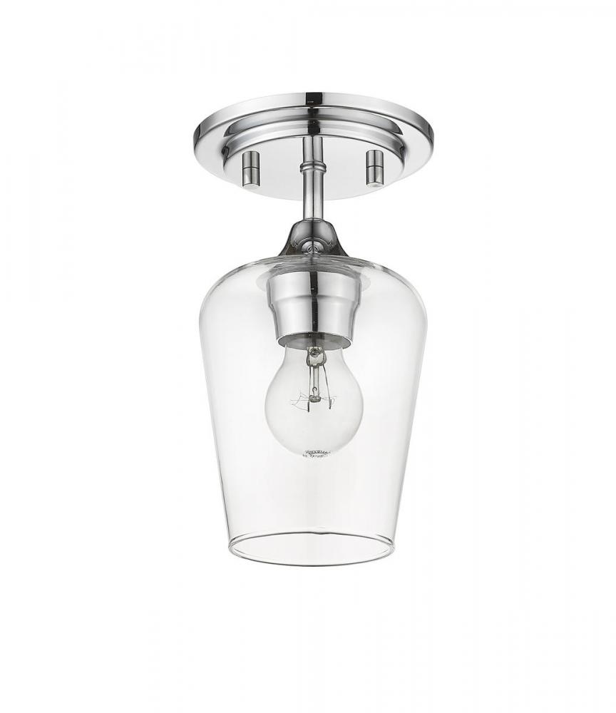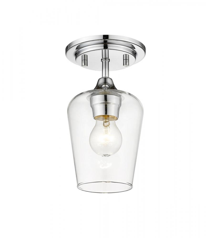 With a novel silhouette resembling an inverted goblet, this ultra-modern one-light flushmount ceiling light captures attention and admiration in a dining area, living space, or bedroom. Keep up with contemporary custom style with this sophisticated light from the Joliet collection. Its large Bordeaux clear glass shade embellishes a radiant chrome finish mount and round canopy, delivering a low-key yet high-class effect.