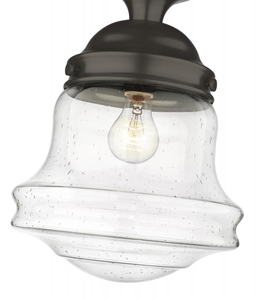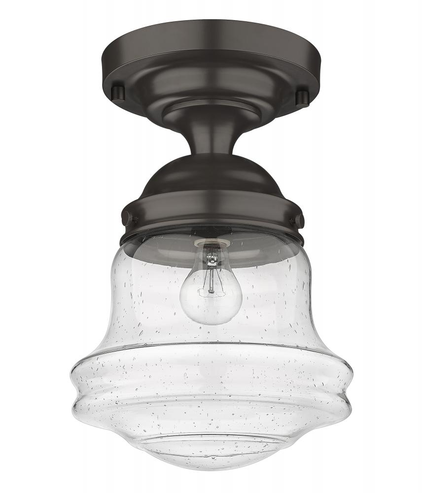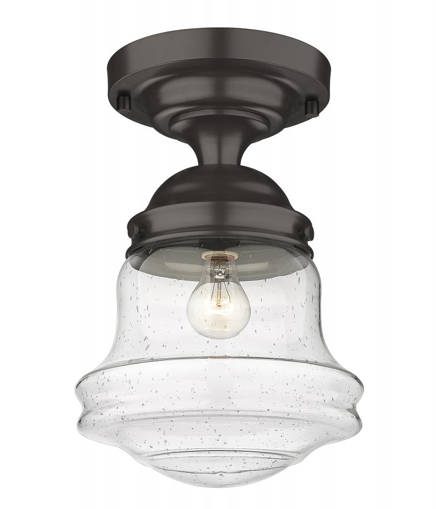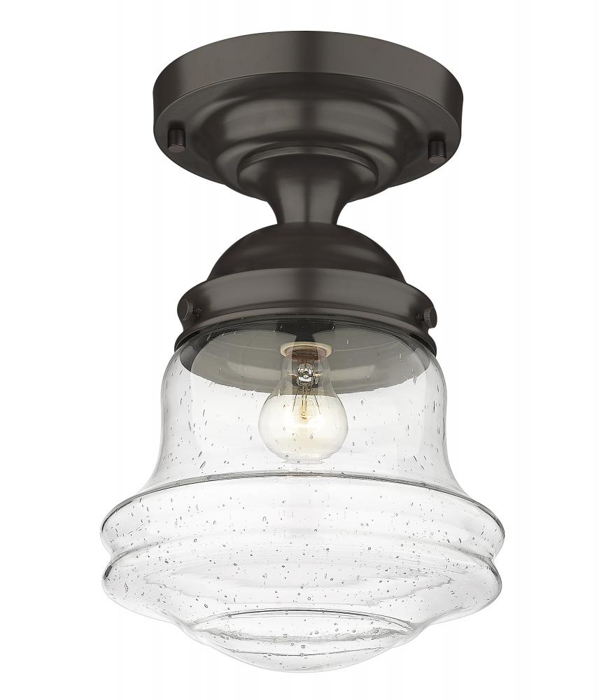Give your space a modern farmhouse feel or restoration aesthetic with this single light flush mount, designed with a sleek contoured silhouette and a dark bronze finish that creates a metallic element to the space. A perfect addition to a powder room or compact space, this Mid-Century Modern-inspired flush mount also offers an artisan quality with a clear seedy glass globe that presents an old-world charm and texture. Mount this transitional flush mount within a sophisticated yet rustic country setting, elevating the interior with contrasted luxe materials.
