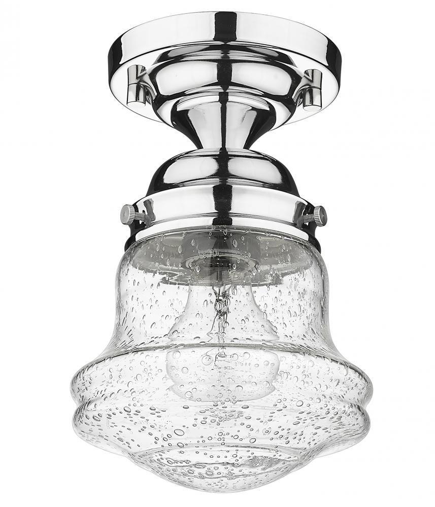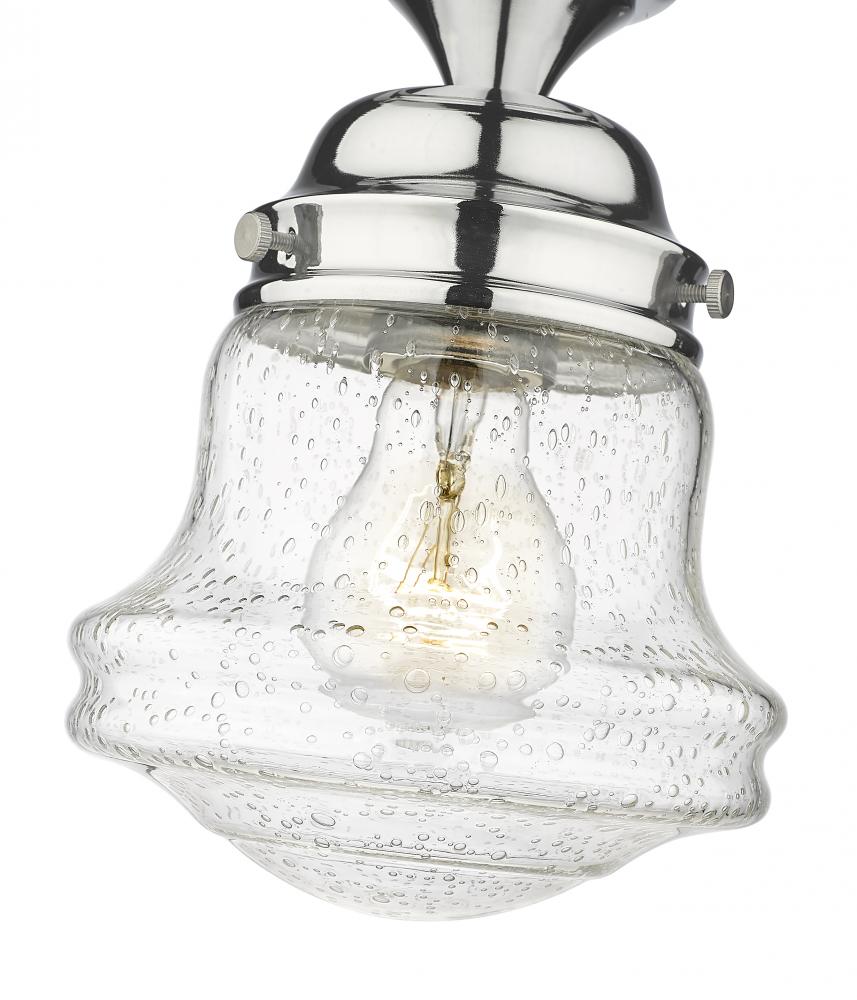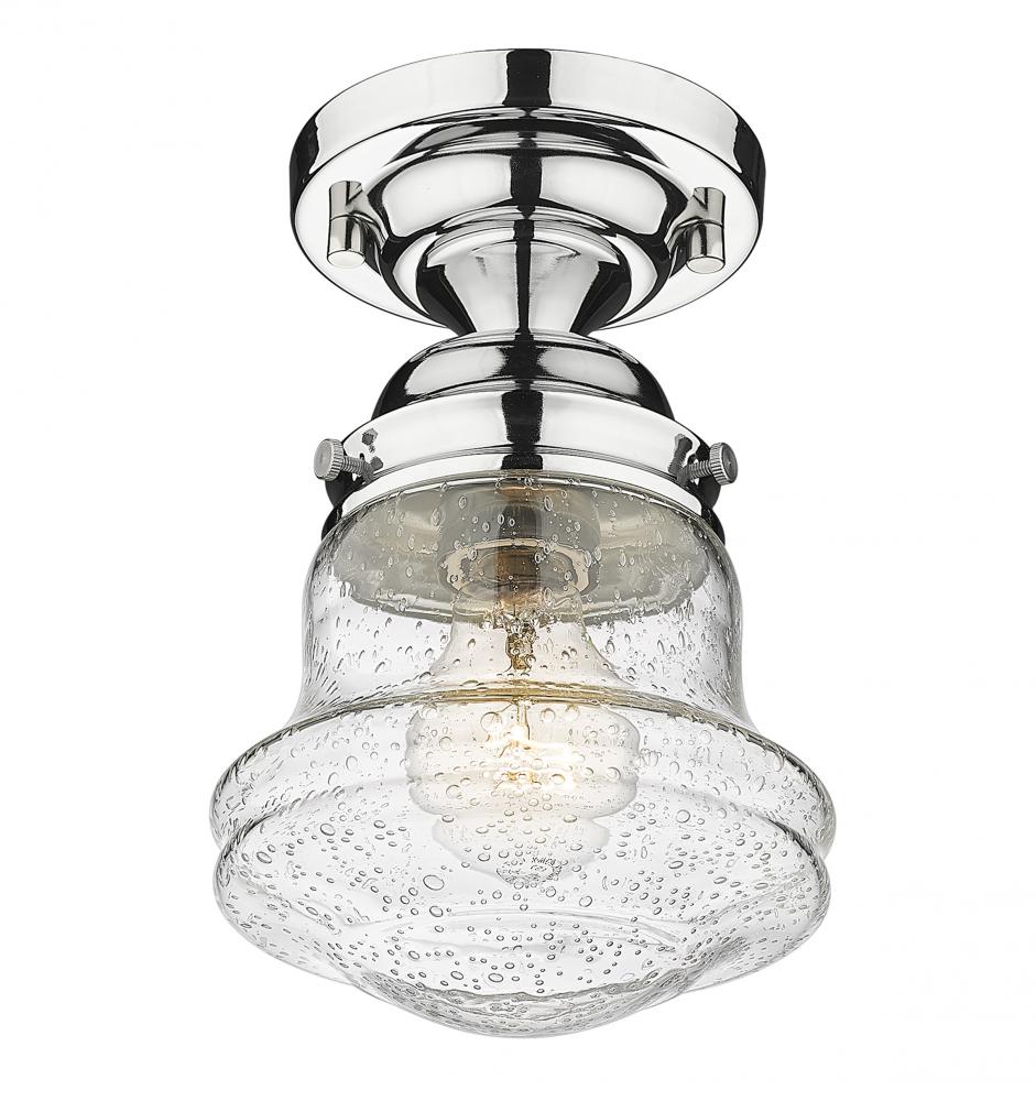 Give your space a modern farmhouse feel or restoration aesthetic with this perfectly sized, petite single light flush mount, designed with a small yet sleek contoured silhouette and a shiny polished chrome finish that creates a subtle metallic touch to the space. A perfect addition to a compact apartment foyer or narrow hallway, this Mid-Century Modern-inspired flush mount also offers an artisan quality with a clear seedy glass globe that presents an old-world charm and texture. Mount this small transitional flush mount within a sophisticated yet rustic country setting, elevating the interior with contrasted luxe materials.