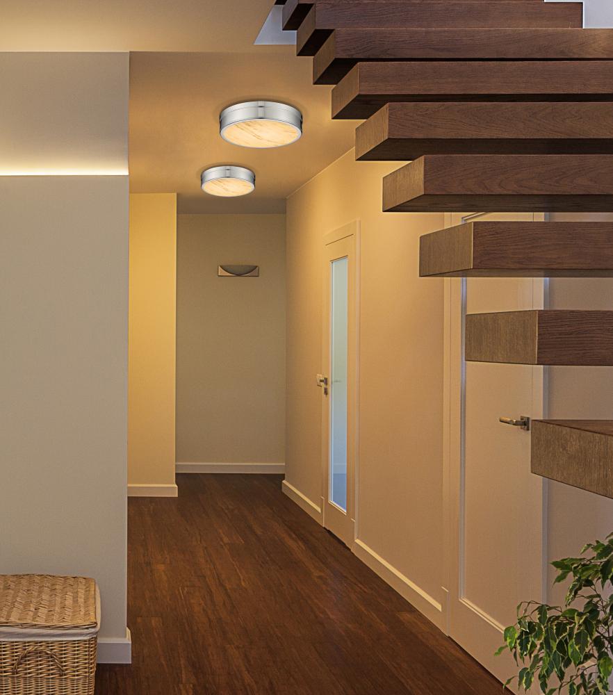 Delivering a smooth, relaxed aesthetic suited to a host of settings, this flush mount ceiling light from the Anders collection adapts to modern and transitional kitchens, living areas, and dining rooms. Clean design elements gleam with a circular polished nickel finish steel frame and canopy hugging a translucent alabaster diffuser that creates glowing light effects. This fixture?s banded metal design invokes an updated dose of industrial chic.