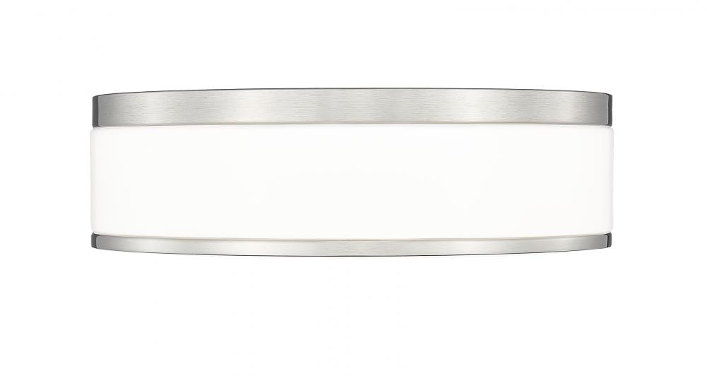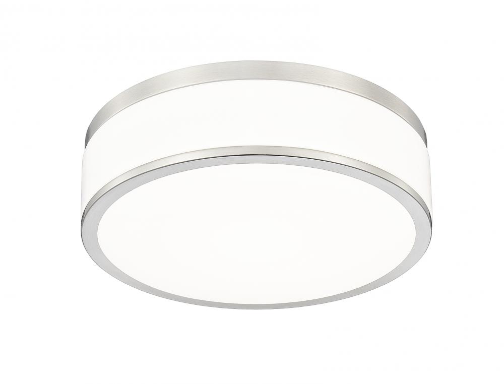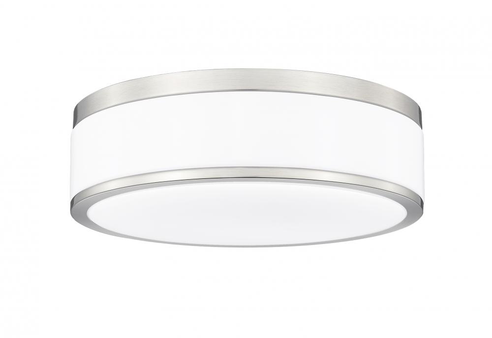Chic metallic banding in brushed nickel pairs with frosted acrylic for a stylish look and soft illumination from this modern flushmount LED ceiling light. Its a fit for contemporary living spaces and bedrooms, offering a refined but understated style. The fixture is dimmable, assuring ambient illumination to suit every occasion.