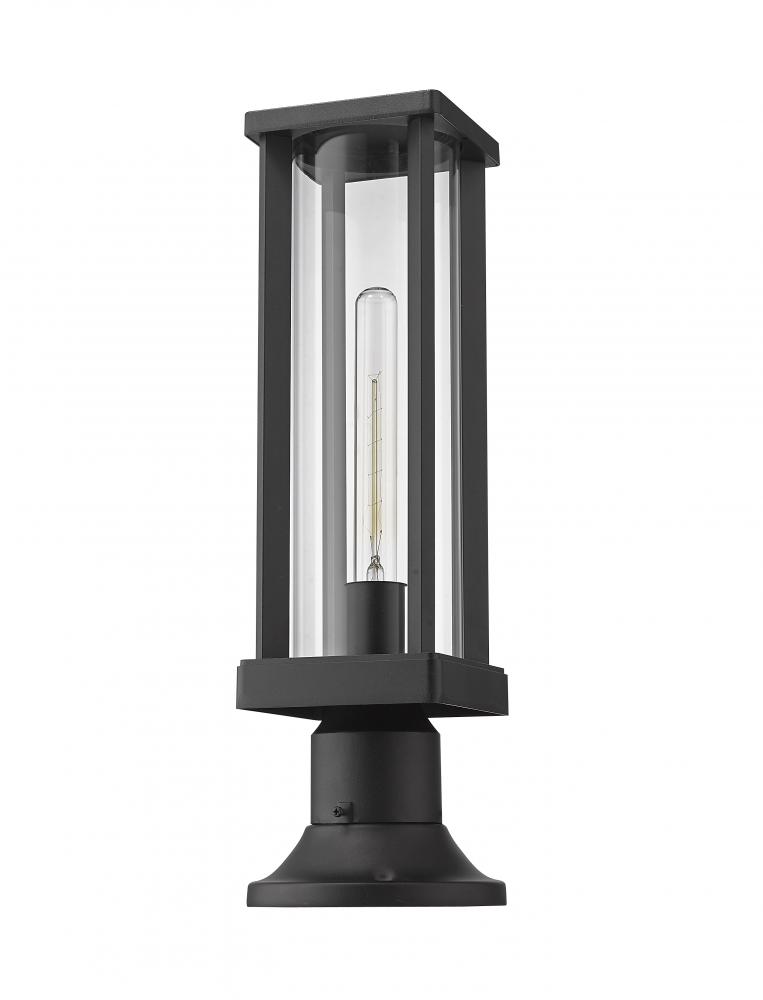 As part of the Glenwood lighting collection, this contemporary outdoor pier mounted fixture is perfectly suited for driveway columns and patio railings. Encased in a rectangular, ultra-modern aluminum frame, this lighting piece features a tube-style clear glass lantern that displays a bright bulb while protecting it from the elements. With a dark black finish throughout the frame and pedestal base, this pier mounted lantern fixture complements a variety of architectural facade styles and color palettes.