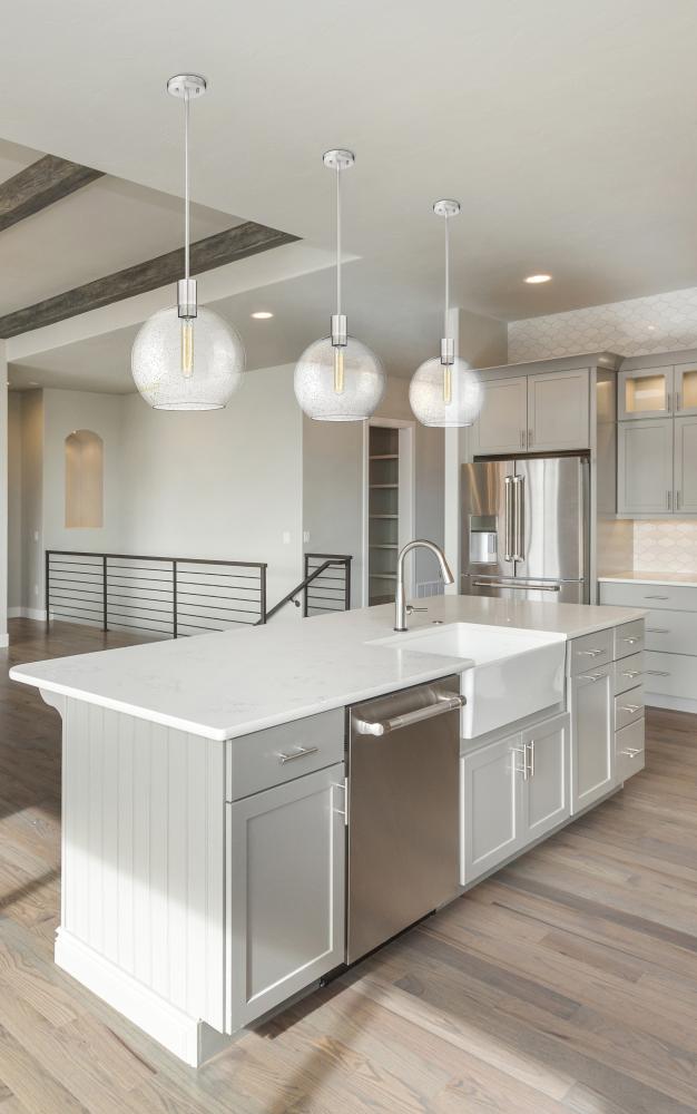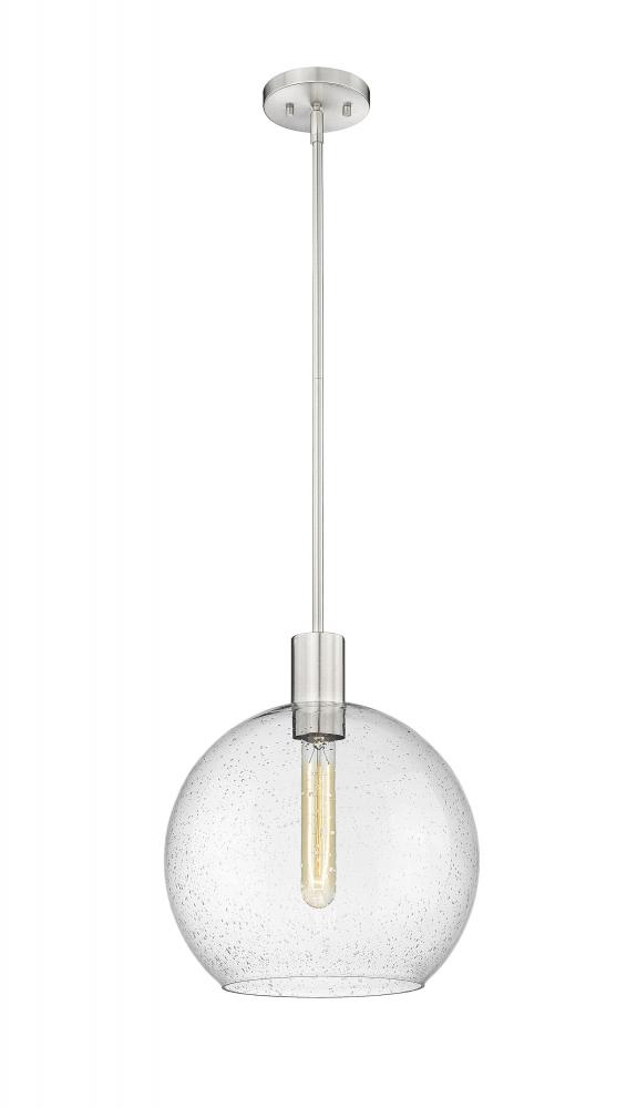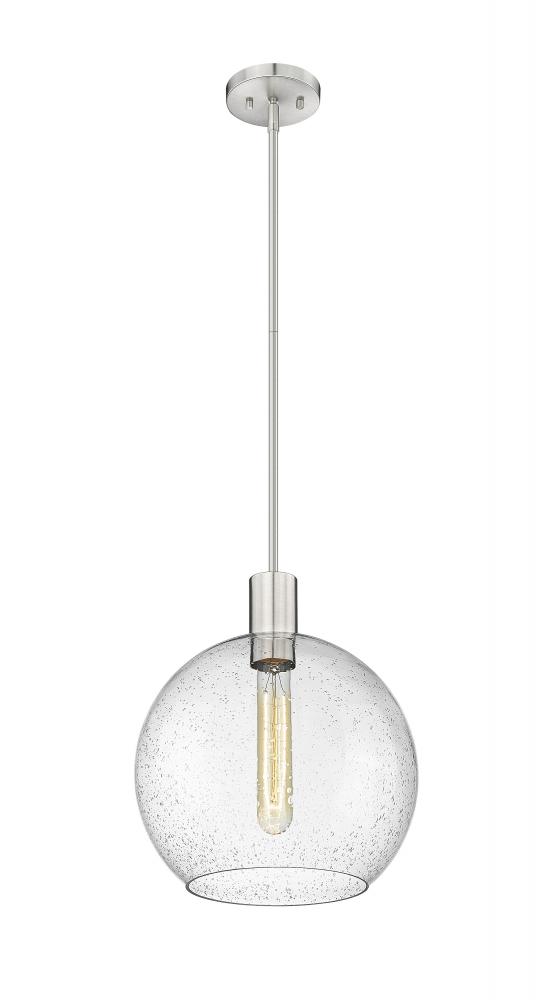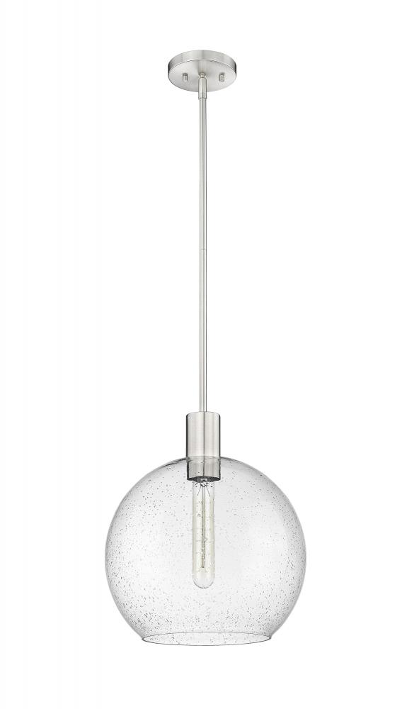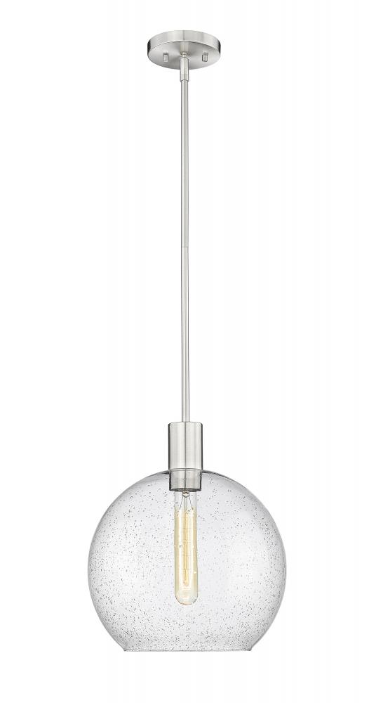 The slender clean lines of the shiny brushed nickel suspension rod offer an elegant metallic touch to interiors, making this contemporary single light pendant and gorgeous minimal style addition to communal spaces within the home. Grounding this transitional pendant light is a Mid-Century Modern seedy glass globe that offers a translucent material, showcasing flickering warm Edison style bulb tucked inside. Contrasted smooth metals and textural glass elevate this linear transitional single light pendant into a classy, understated accent piece in kitchens, foyers and so much more.