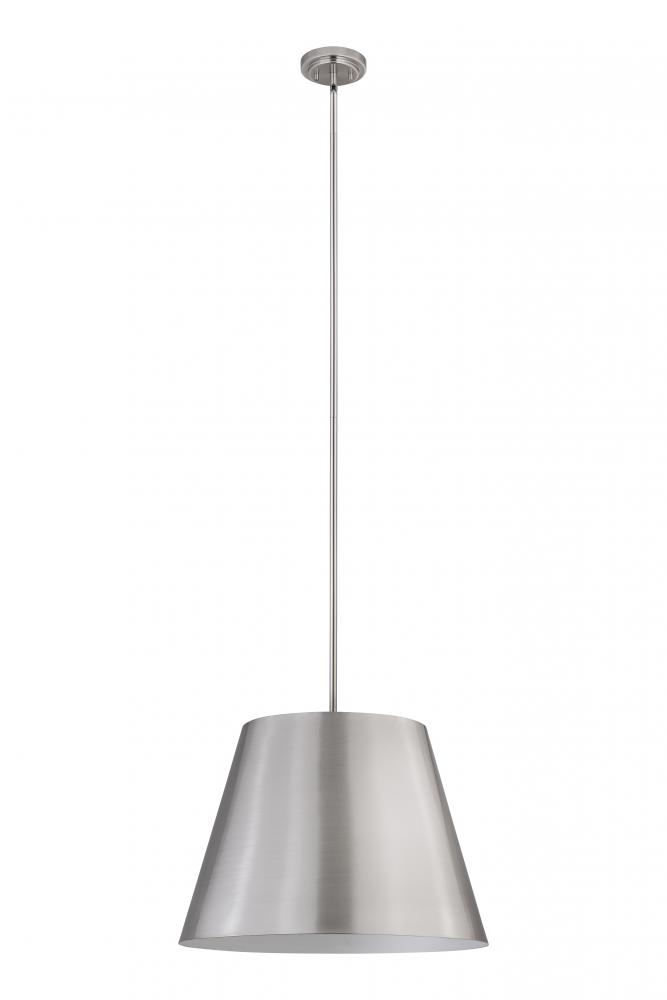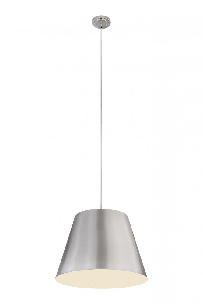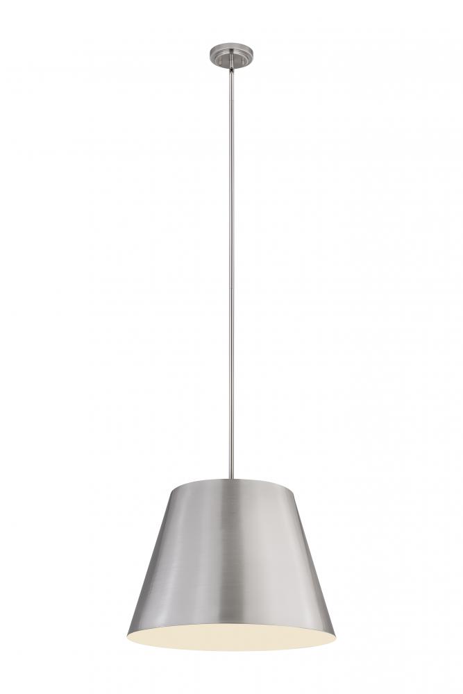 Bright, direct illumination radiates beautifully from a modern one-light pendant with a metal shade. The contemporary empire silhouette is exceptionally versatile as it offers a chic brushed nickel finish and a white interior for excellent lighting in any setting.