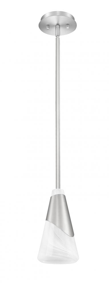The cool curve of a metal shroud adds dynamic flair to this modern pendant light. Fashioned with a swirling art glass shade, it delivers bright, true illumination that lends impeccable ambiance to kitchens, baths and living areas. A brushed nickel finish gleams in the light, complementing the canopy, downrod, and shroud to perfection.