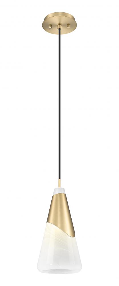 Graceful curves set the tone for a modern one-light pendant. From the Aimie collection, it creates richness and warmth with a curvy metal shroud in a modern gold finish that matches its round canopy. A conical shade of icy swirled artisan glass diffuses illumination and offers regal beauty in any setting.