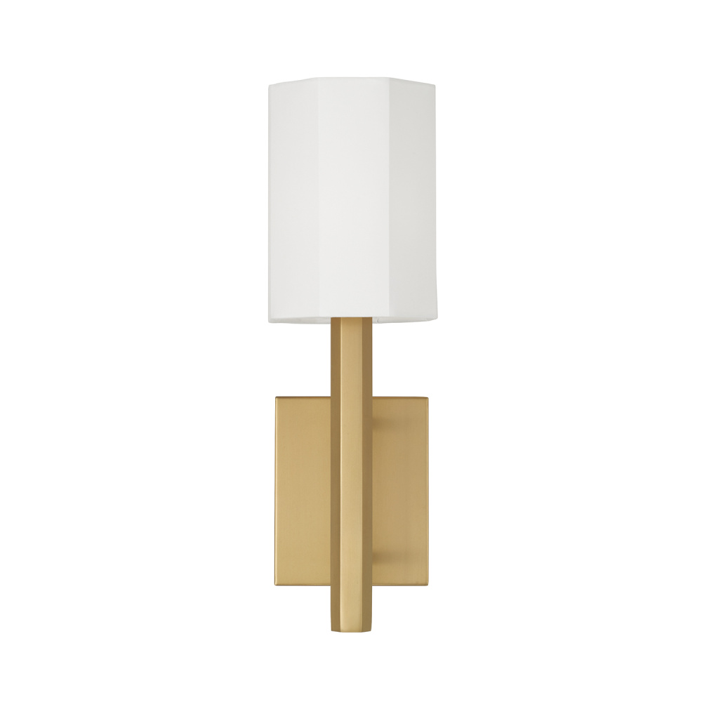 Geometrically inspired, the Adrian Sconce brings a structural silhouette with high style. The White fabric octagonal shade and faceted candle sleeve create striking dimension, while the Aged Brass finish adds a classic touch.