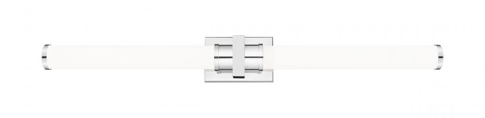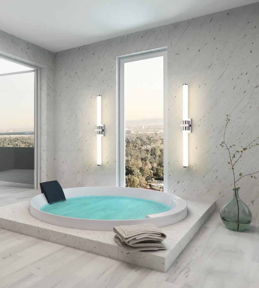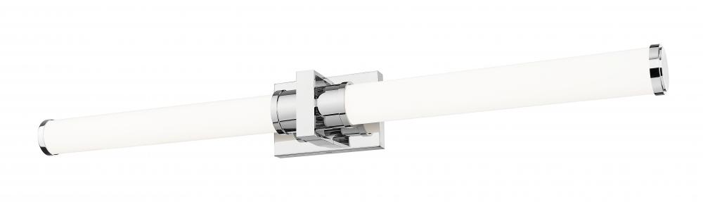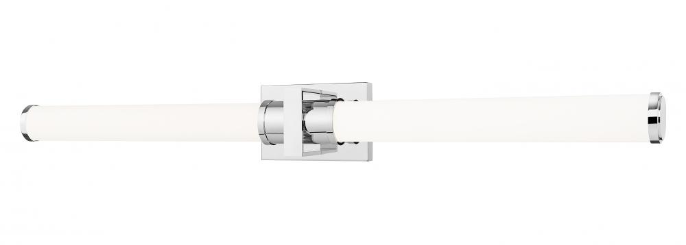 Integrated LED lighting is energy efficient and dimmable, making this modern vanity bath light the perfect upgrade in a contemporary home. Its gleaming chrome finish is versatile and refined, accentuating a rectangular wall plate, square cuff, and decorative end caps. The dimmable LED light is diffused with a pair of opal glass cylinders, casting glowing, even illumination across your vanity.