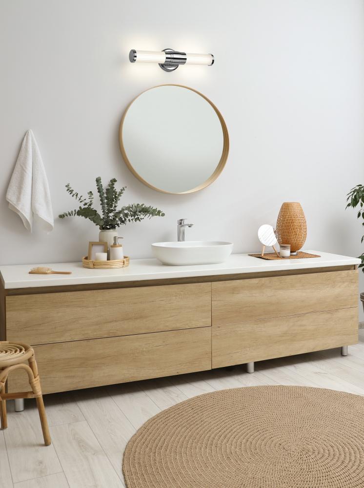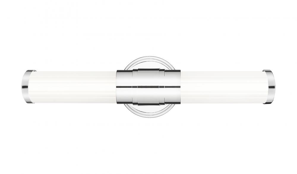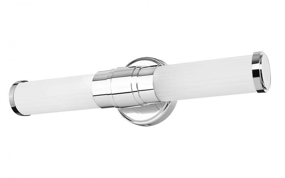Delicate ribbed glass adds texture and depth to a modern LED vanity bath light. Its a clean, precise look with a chrome finish over its steel frame, with a stepped collar that conceals its integrated LED light. The energy efficient fixture is dimmable and color selectable for the perfect look in any bath.