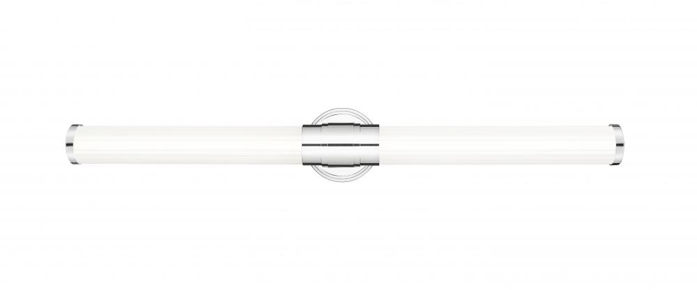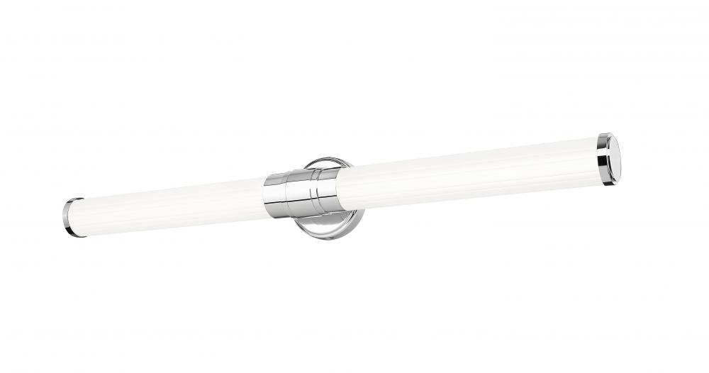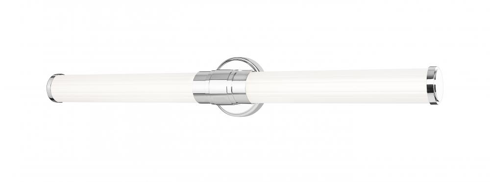 Cast bright, diffused illumination across your space with this modern LED vanity bath light. It features a steel frame in a gleaming chrome finish, complete with a stepped collar that adds detail to a pair of ribbed opal glass shades that deliver inviting illumination. The fixture is designed with an energy efficient, integrated LED thats both dimmable and color selectable with five options to create the perfect ambiance.