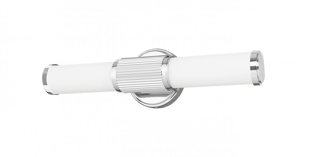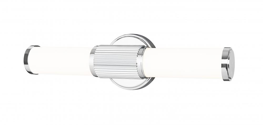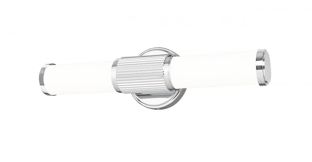 Bright chrome emphasizes the textural contrast featured on this modern LED vanity bath light. Its fluted cuff and beveled wall plate host a pair of cylindrical opal glass diffusers, creating soft, inviting illumination thats perfect for vanities, dressing spaces, and other living areas within your home. Stylish and energy efficient for modern living.
