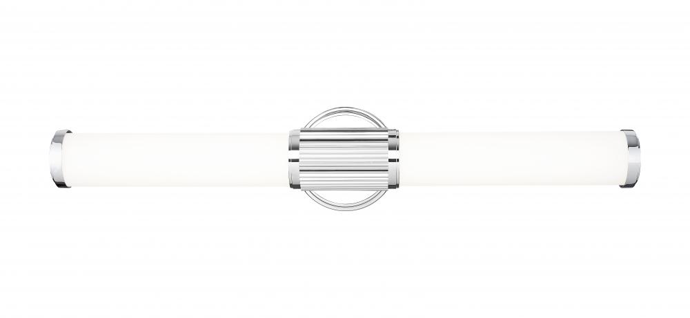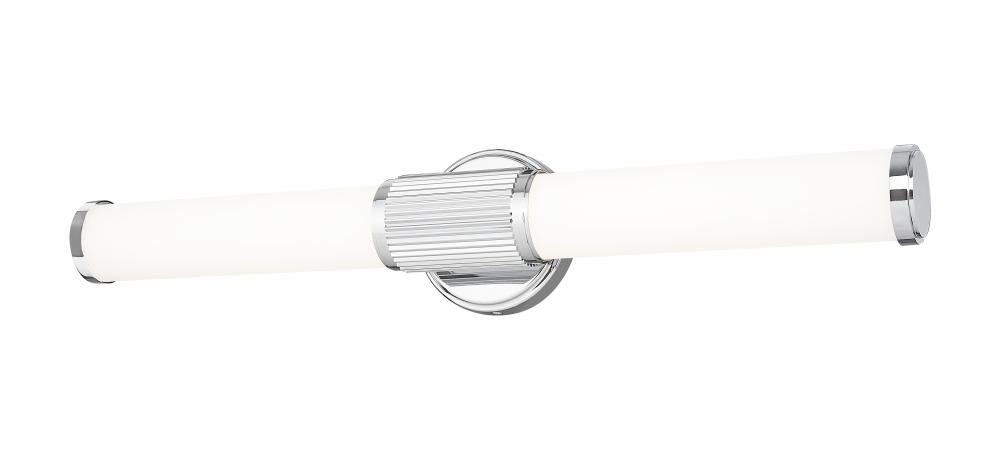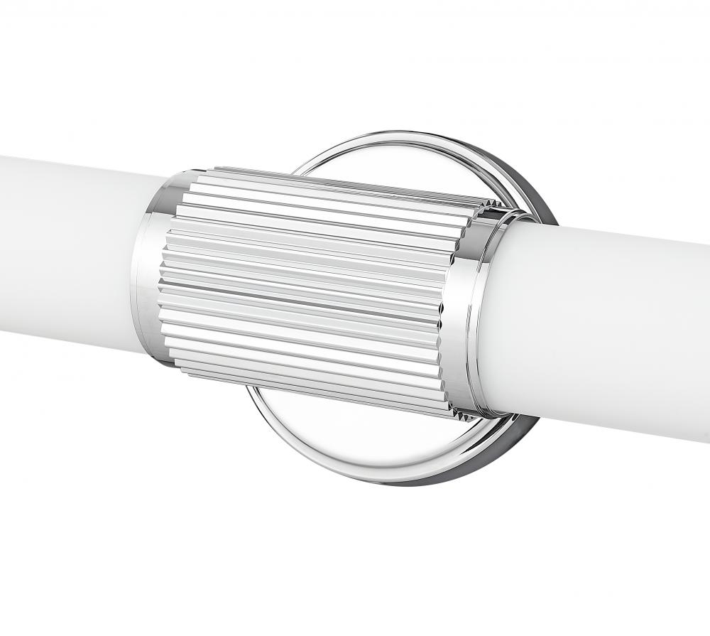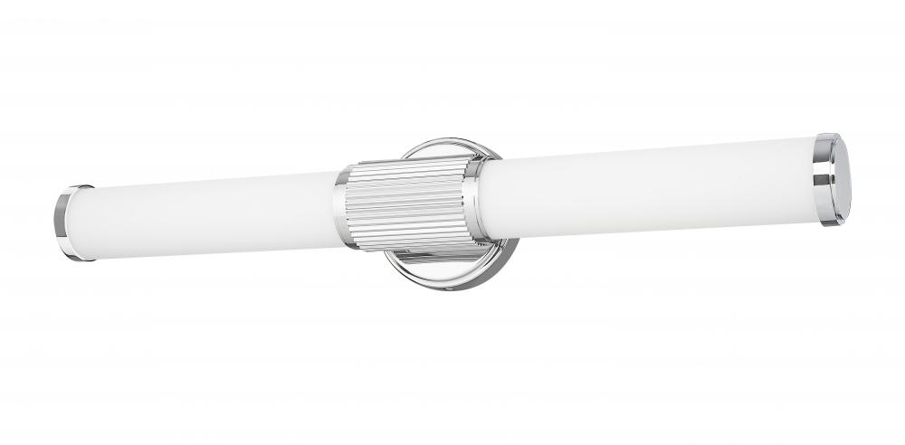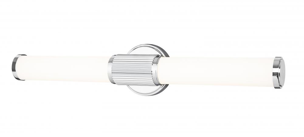Put a stylish spin on your primary or guest en suite with this modern LED vanity bath light. In polished chrome finishing, it offers bright, clean style with a steel frame that pairs a beveled wall plate with a fluted cuff, creating impeccable texture and depth. Opal glass shades diffuse illumination, offering excellent ambiance for every occasion.