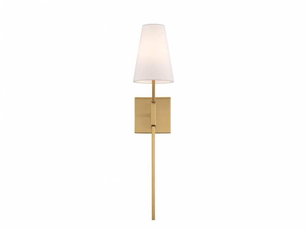 If you want to add a touch of chic, classic style to any room, look no further than this 1-light sconce. Finished in Natural Brass, pairing a pencil-sleek body with a bold square backplate and a white linen fabric shade, it is great whether used solo or in groupings. This sconce is 24" in height, 5" in width and extends 6.5" from the wall. It uses 1 candelabra size bulb of up to 60 watts. Bulb not included.