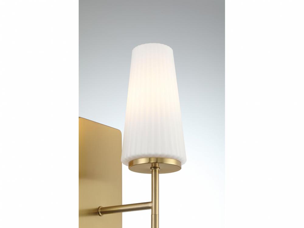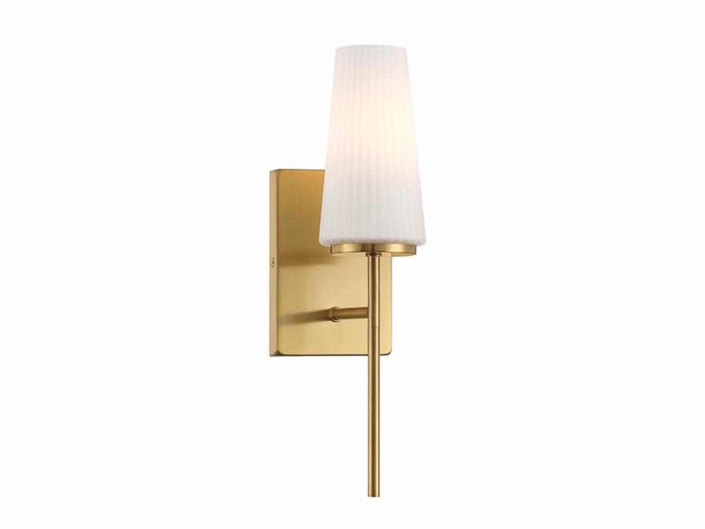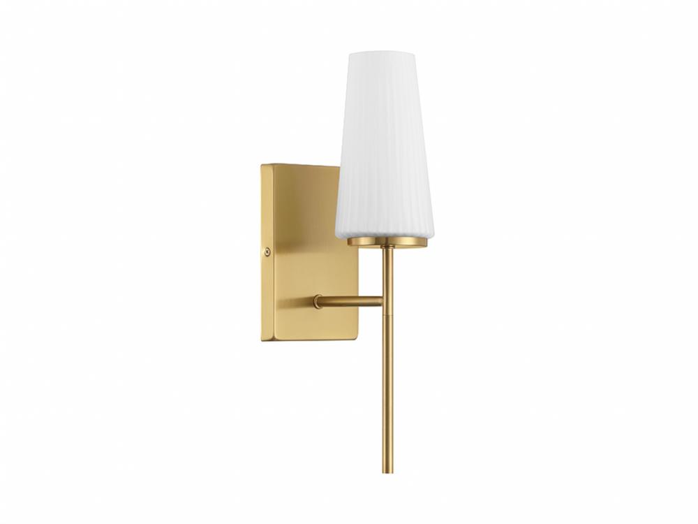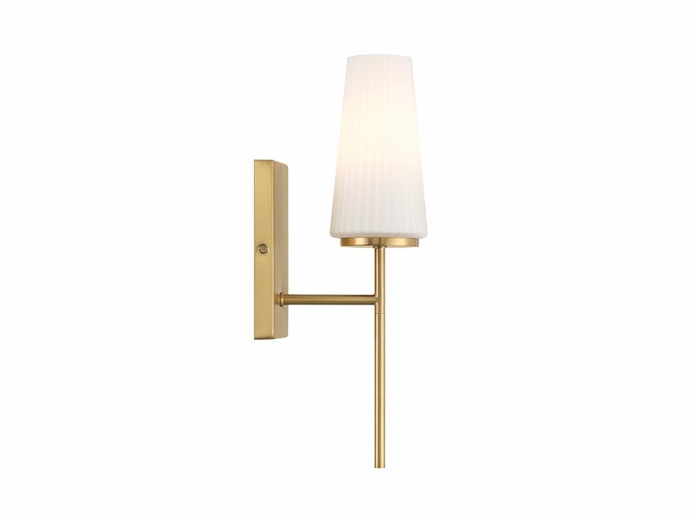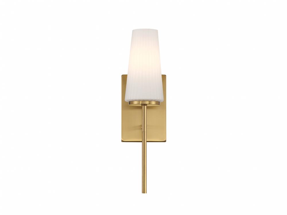 The stately style of this 1-light sconce is a superb choice for any space. A tall, sleek conical shade of white opal fluted glass sits atop a slender arm that is finished in Natural Brass. Use this sconce individually or in groupings to brighten up every room. It is 16" in height, 4.75" in width and extends 6.5" from the wall. Uses 1 candelabra size bulb of up to 60 watts. Bulb not included.