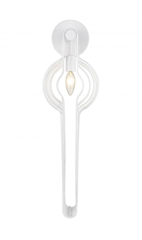 Doubling down on ultra-modern style, this single-light wall sconce becomes a focal point in a contemporary bathroom, bedroom, or hallway. Careful detailing yields a linear design of long white finish steel rods and a glossy white finish frame. A charming candelabra bulb mount delivers a softening effect with pure style.