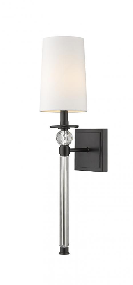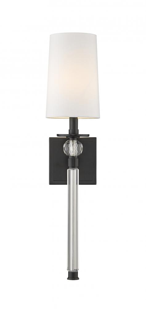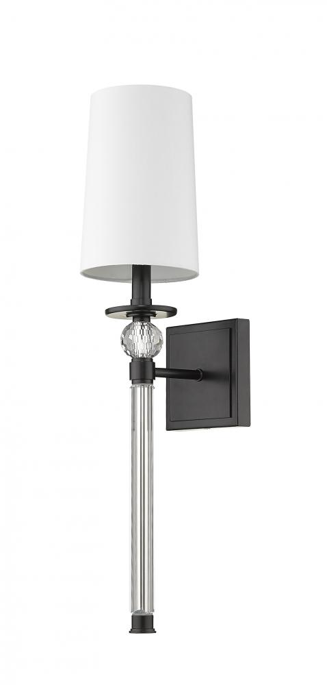 Light up a powder room, bedroom, or hallway with the exquisite artistry of this one-light wall sconce. A traditional lamp motif is modernized with tailored design elements featuring matte black finish steel and crystal. Topped with a fresh white fabric shade, this sconce becomes part of a sophisticated look in a contemporary or transitional space.