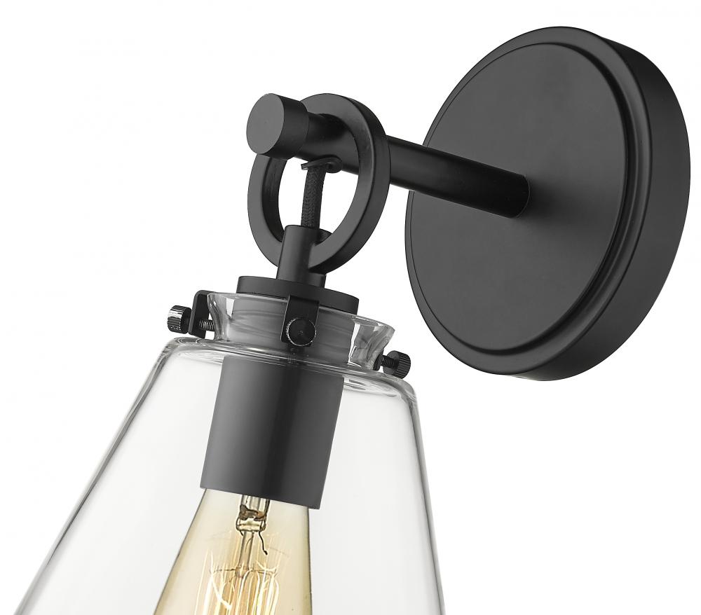 This contemporary one-light wall sconce devotes attention to detail as it delivers fresh, inspiring materials. Make a modern bathroom, bedroom, or hallway come to life with a fixture featuring matte black finish steel and a conical clear glass shade.