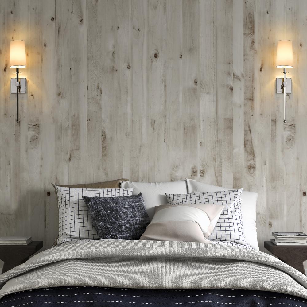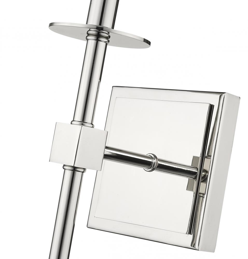Long lines and an elegantly simple motif lend sophistication to this contemporary polished nickel finish one-light wall sconce. Mirroring a traditional lamp motif, its steel frame and wall mount join a tall white fabric shade to form a decadent look with versatility for use in a bathroom, bedroom, or hallway.