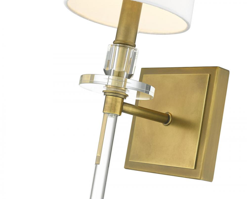 Sophisticated and tasteful design elements blend rubbed brass and brushed nickel finish steel with crystal accents and a fresh white fabric shade, making this single-light wall sconce an optimal choice for a modern or transitional space. Perfect for a bathroom and vanity, bedroom, or hallway, this elegant light captures the traditional lamp design with modern twists and offers extraordinary versatility.