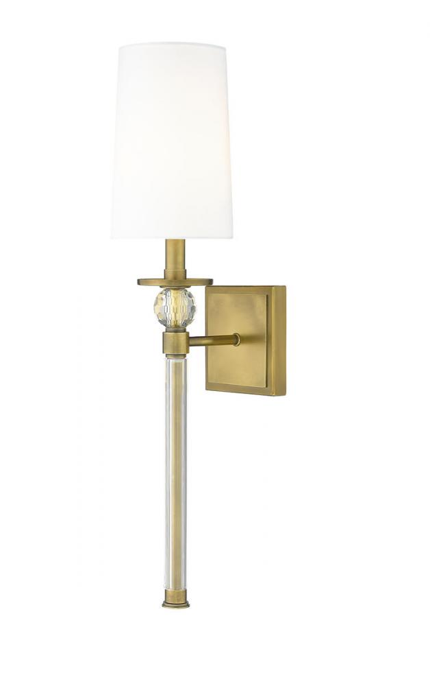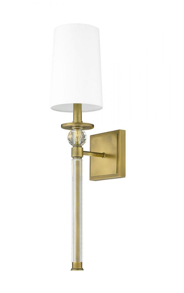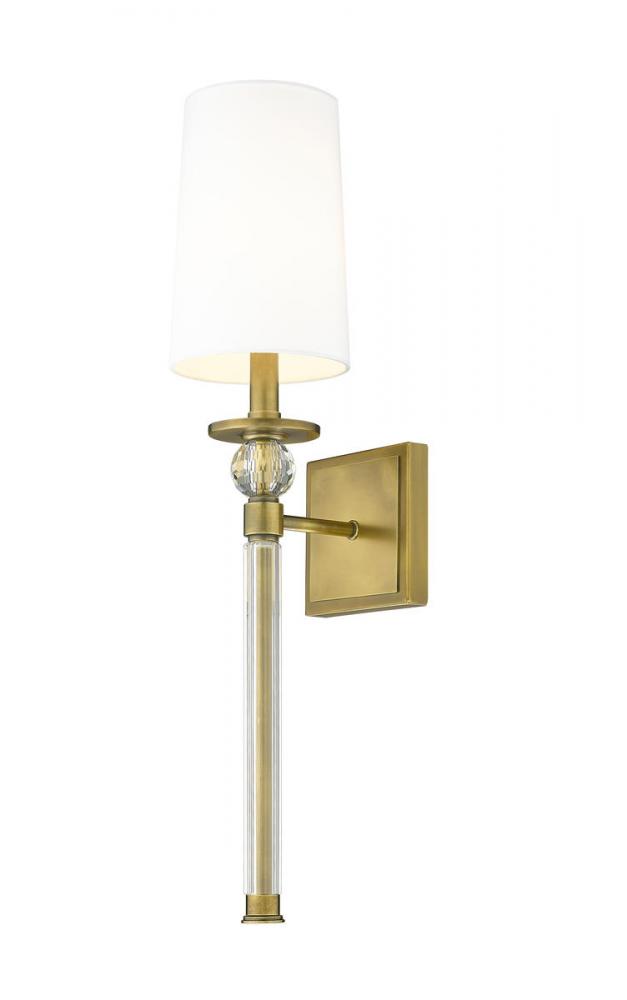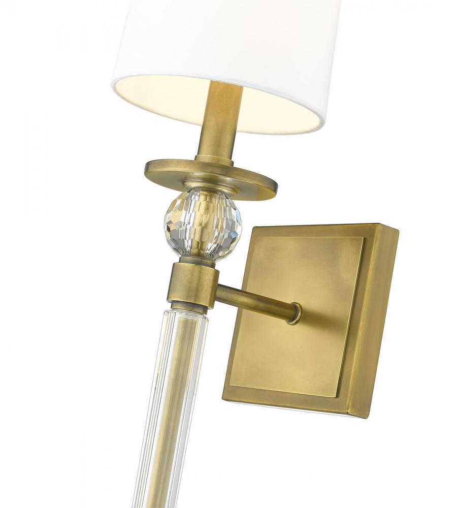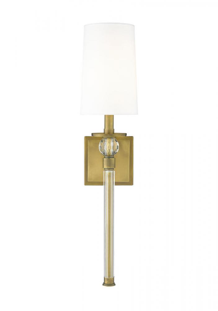 Light up a powder room, bedroom, or hallway with the exquisite artistry of this one-light wall sconce. A traditional lamp motif is modernized with tailored design elements featuring rubbed brass finish steel and crystal. Topped with a fresh white fabric shade, this sconce becomes part of a sophisticated look in a contemporary or transitional space.