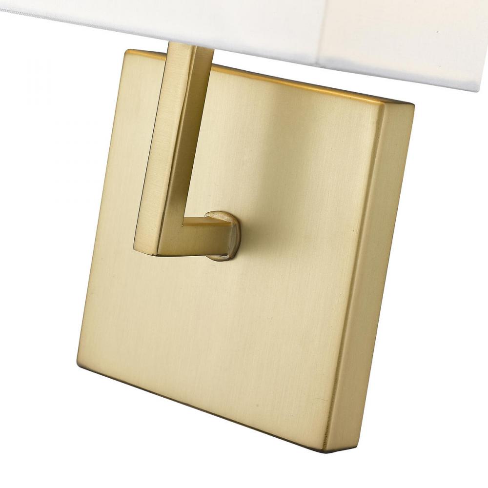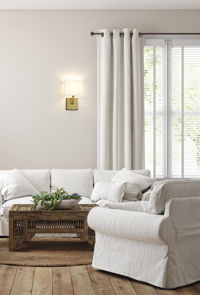 Add a touch of modern appeal to your design with this sleek metal sconce, beautifully supported by a crisp off-white fabric shade. The clean look is reinforced by the sleek arm and backplate. The half-shade design gives the sconce a space-saving low profil