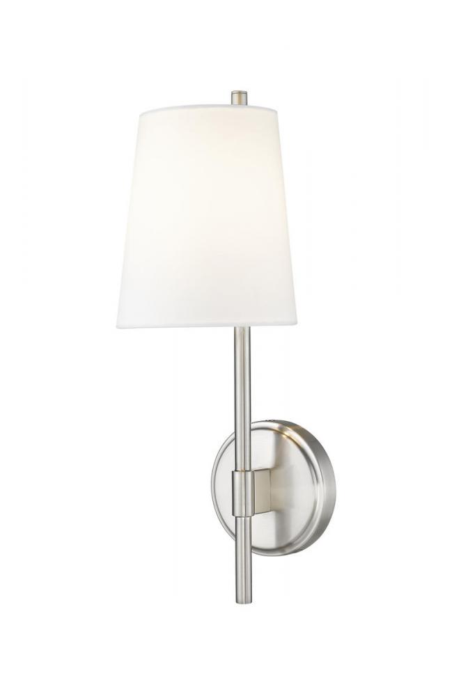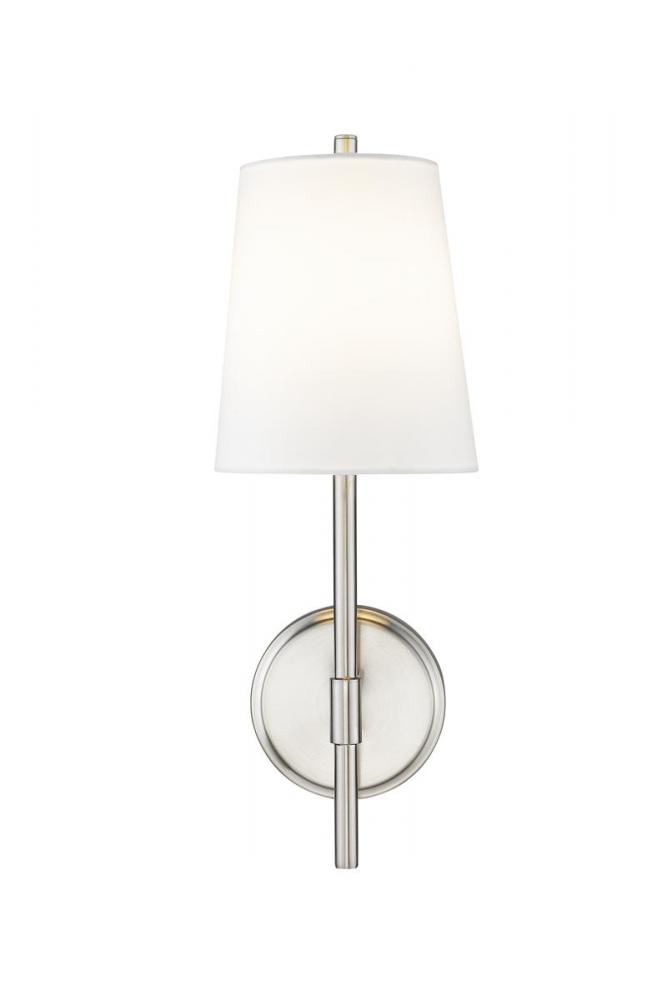 Classic traditional style takes on a modern twist in this light, airy one-light wall sconce from the Winward collection. With a rounded backplate and tubular arm made of brushed nickel finish steel and a tapered white fabric shade, its versatility stands second to tasteful elegant personality. Bring targeted lighting to a bath, hallway, or main living space with this updated fixture.