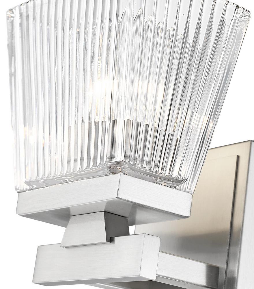 This modern brushed nickel wall sconce is the perfect update to bathrooms and hallways. Featuring a steel construction with clear glass shades with a ribbed texture, its a stunning sconce with farmhouse flair.