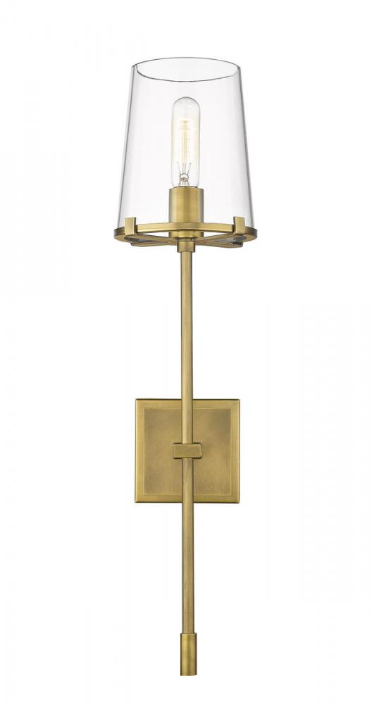 Accent lighting is an essential element of a well-decorated home. With a gleaming rubbed brass finish and a single clear glass shade, this sleek, modern wall sconce brings a room together in effortlessly elegant style.