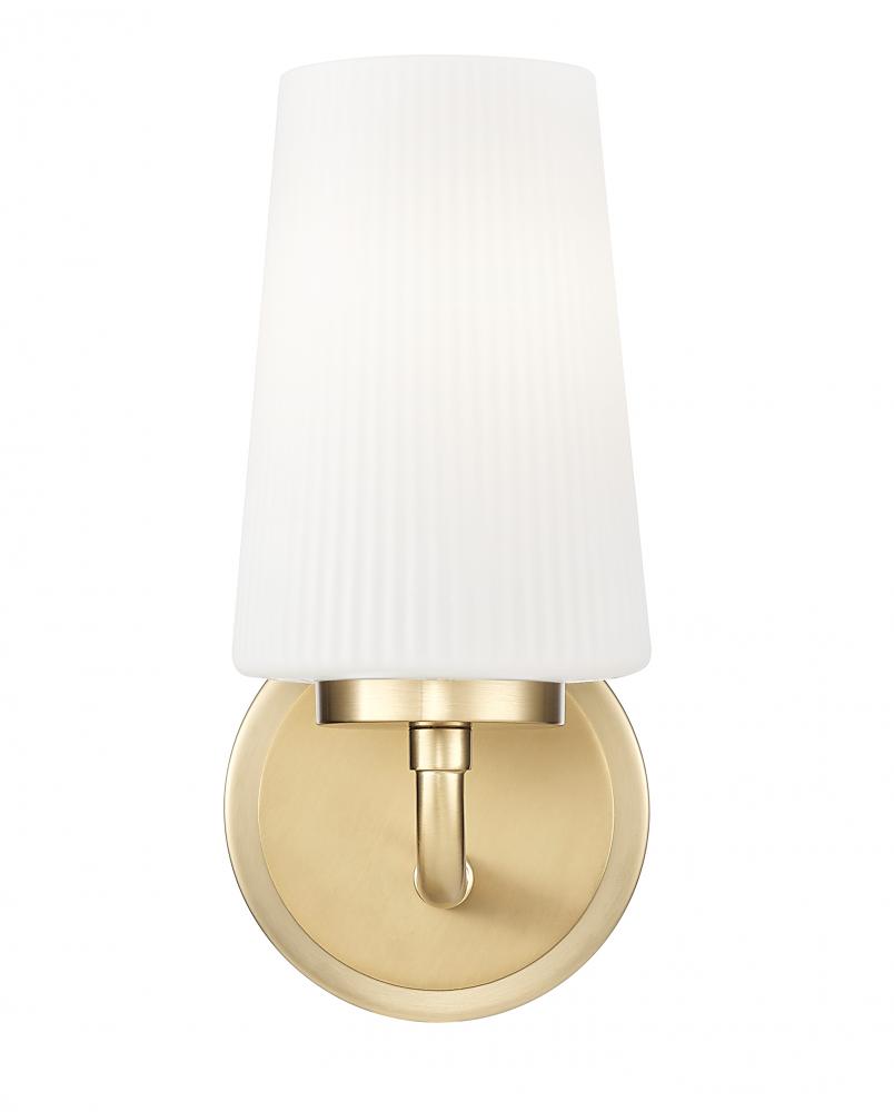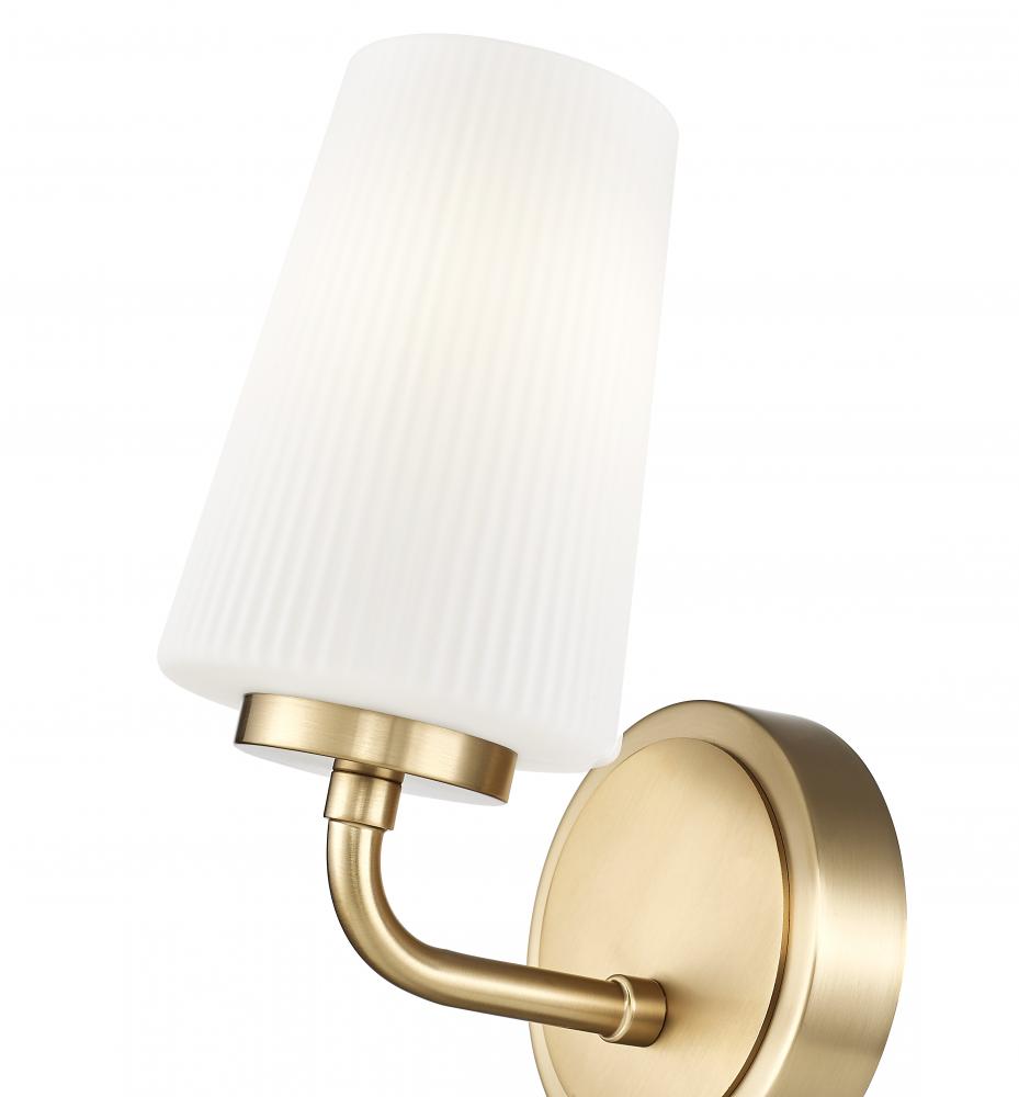 Rich modern gold finishing creates a charming vintage-inspired ambiance for this modern one-light wall sconce. Beautiful flanking a vanity mirror, it delivers soft, inviting illumination with a delicately ribbed opal glass shade with a tapering profile. Its curved arm and round wall plate complete the look with refined, timeless elegance.