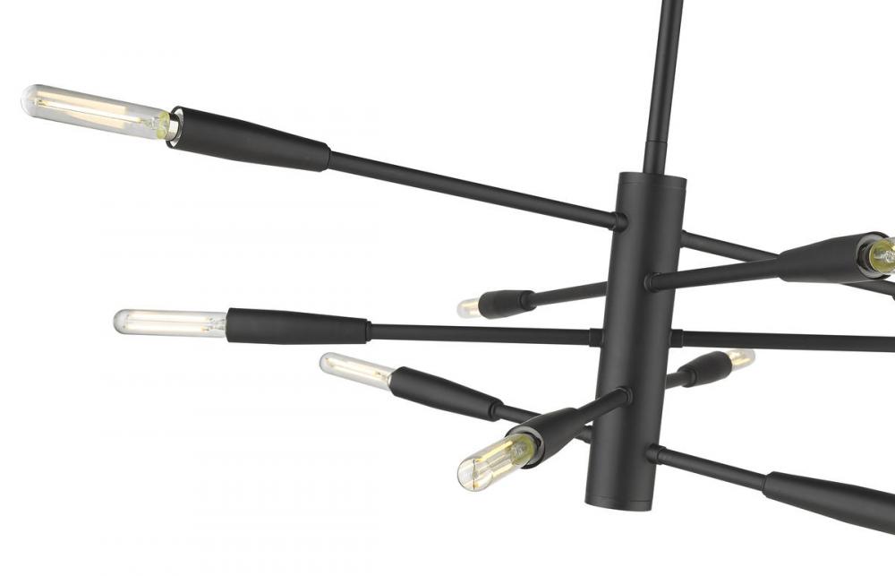 Bring the visual impact of a space-inspired fixture to any contemporary space, adding this dynamic ten-light chandelier to a modern dining room or living area. The sleek look of bold matte black finish steel shapes a linear frame and canopy with slender adjustable arms angled to create an abstract silhouette. This light from the Ascension collection captures attention when mounted on a straight or sloped ceiling.