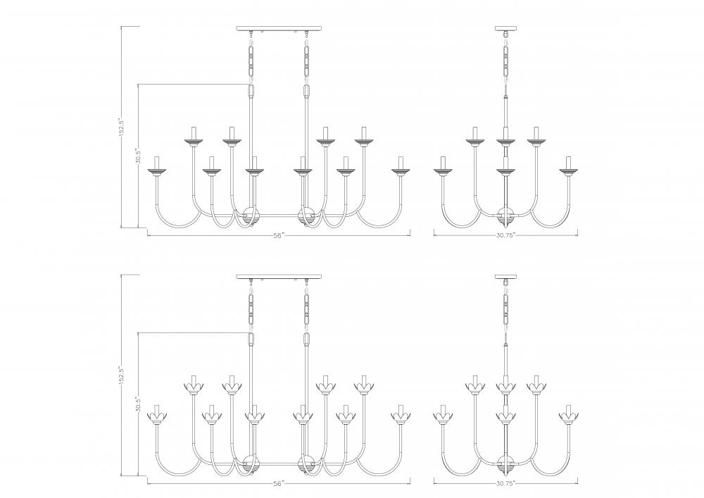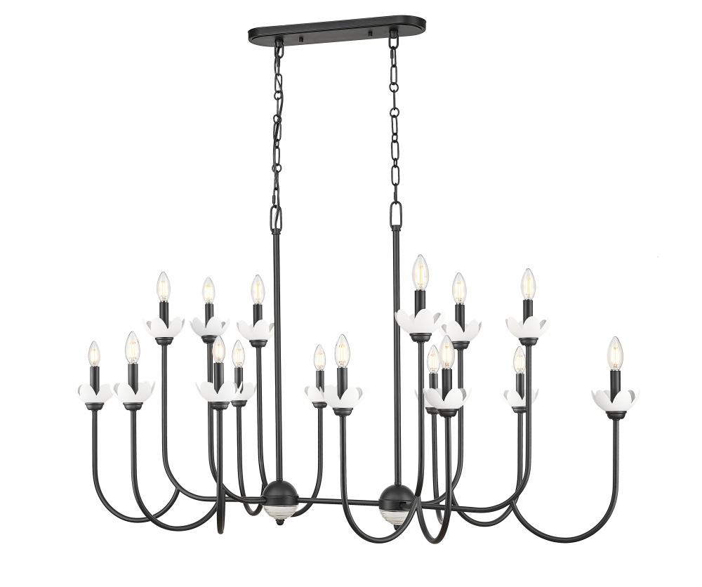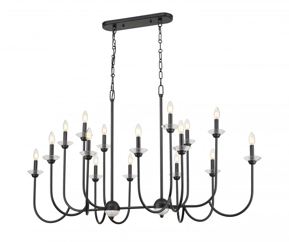Slender, curving arms create a light, almost airy silhouette for this transitional 16-light linear chandelier. IN matte black for optimal contrast, it features delicate floral bobeche details and is adorned with a matching pair of clear glass spheres that add glittering radiance. Its the perfect solution for an approachable and inviting living or dining space.