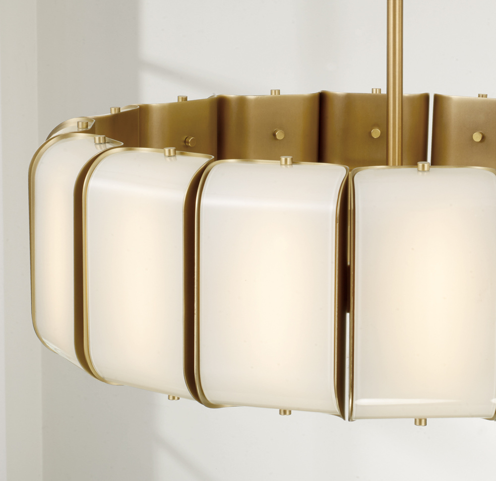 DETAILS: Grounded by Aged Brass details, the curved glass panels create a beautiful multifaceted glow from the chic drum silhouette.