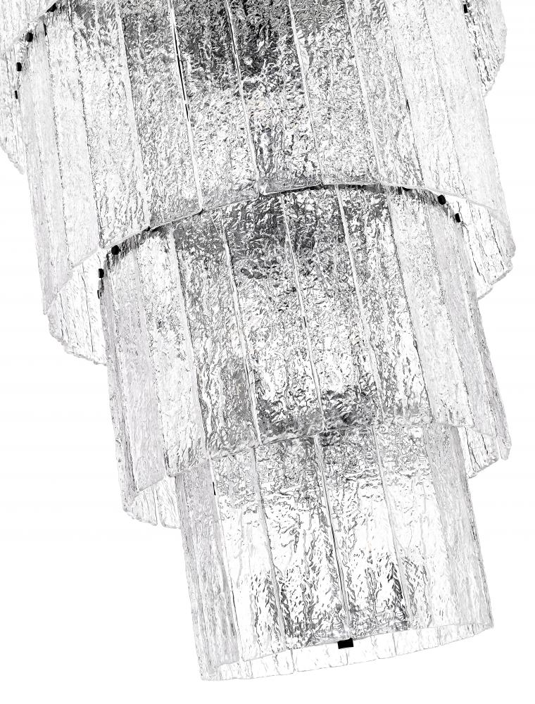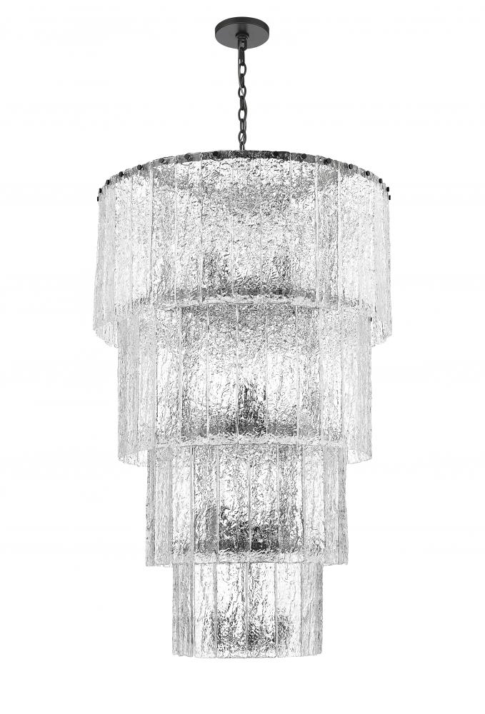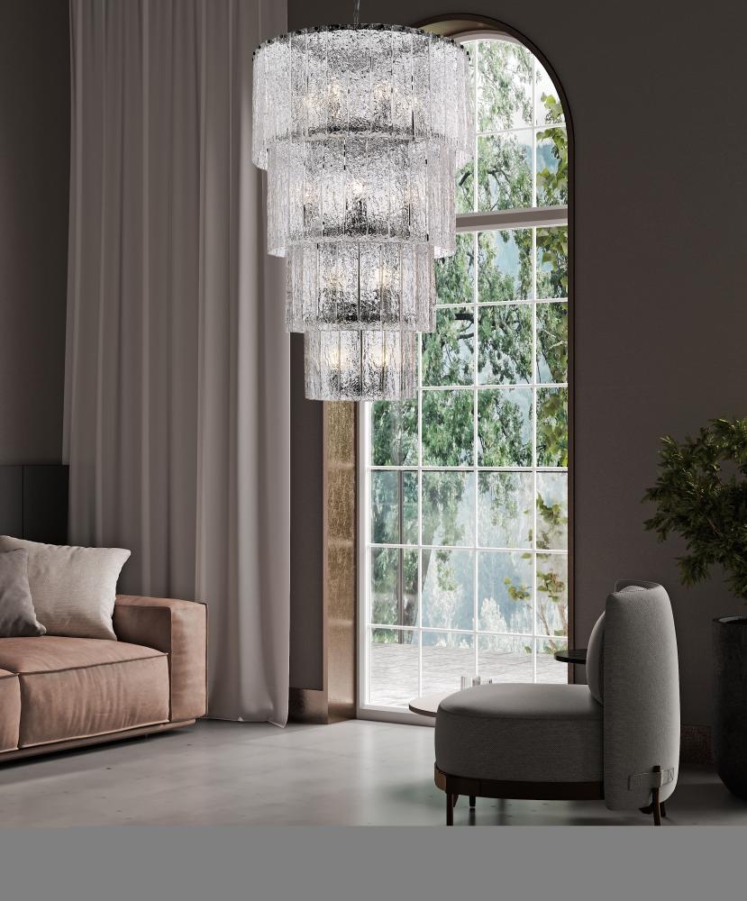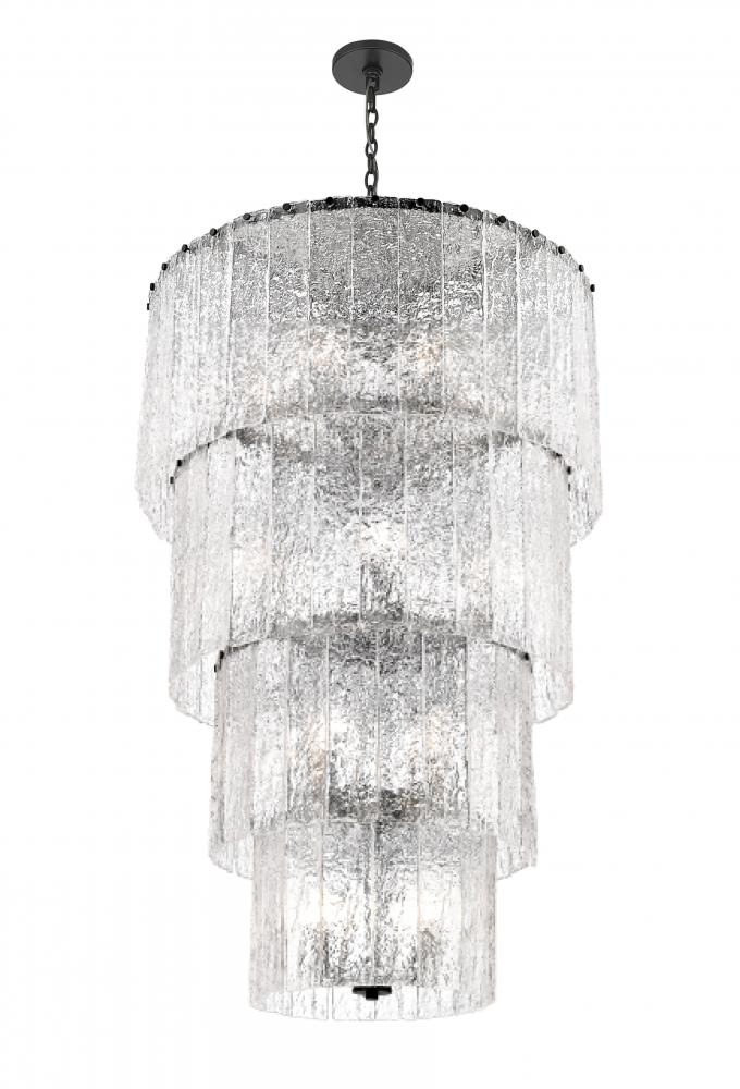 Four dramatic tiers create impeccable sophistication for this modern 18-light chandelier. A stunning centerpiece in your foyer or over a staircase, it radiates elegance with round tiers of icy textured clear glass. A minimalist framework of durable steel receives a contrasting matte black finish, adding dynamic style to any setting.