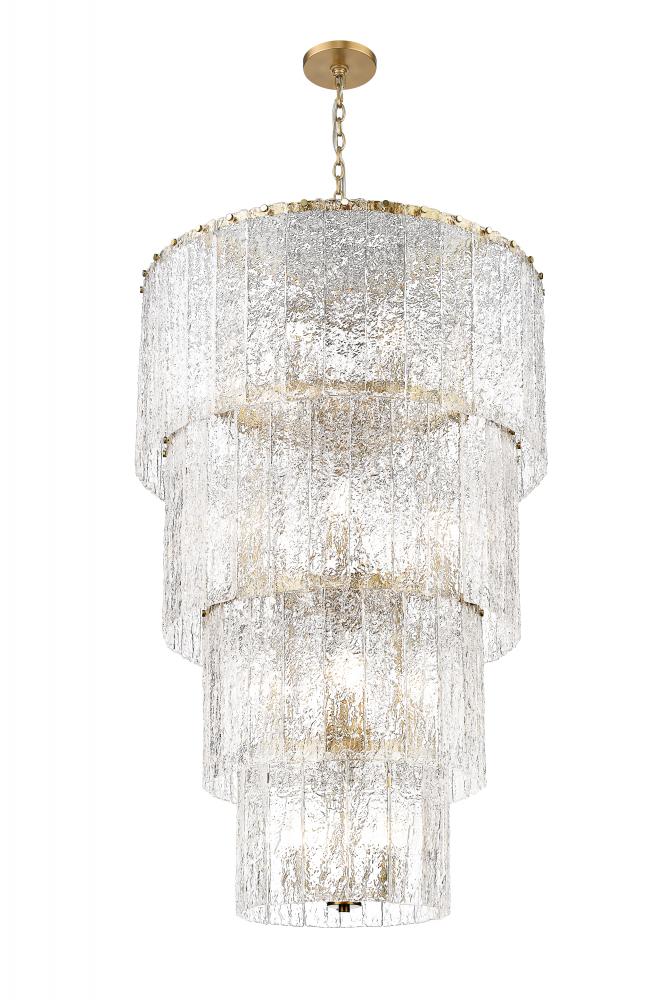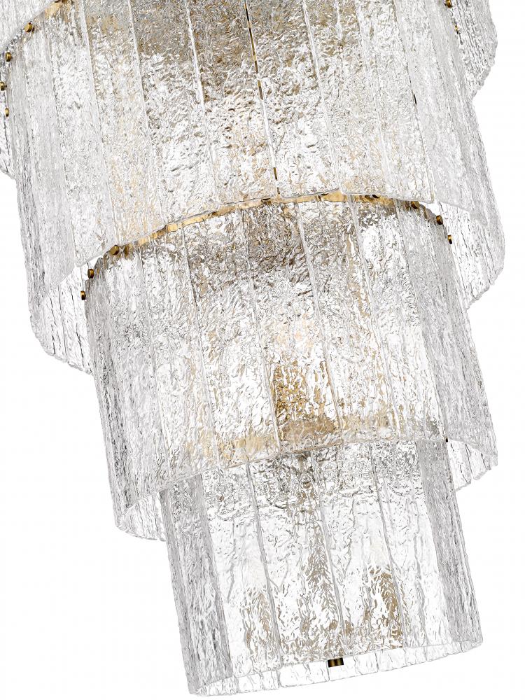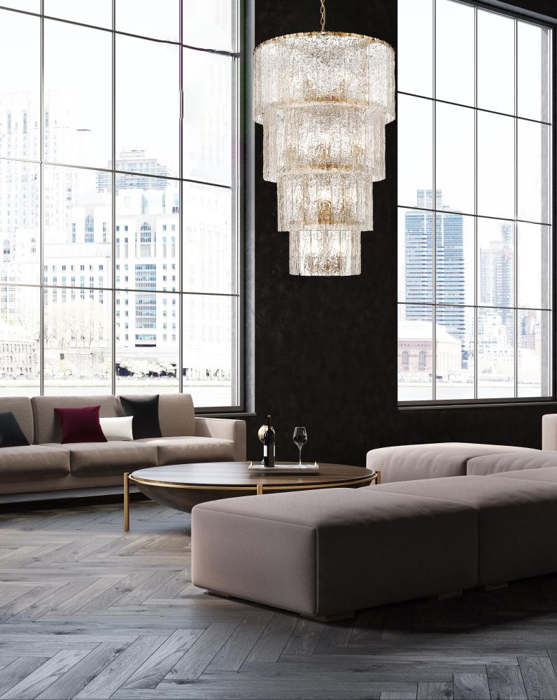 Impeccable ambiance radiates from the warm finish and icy glass featured on a modern 18-light chandelier. A bold centerpiece over a staircase or grand foyer, it boasts four round, graduated tiers that create its chic silhouette. Vertical panels of icy textured clear glass bring impeccable dimensionality, while a modern gold finish over its minimalist steel framework adds inviting warmth.