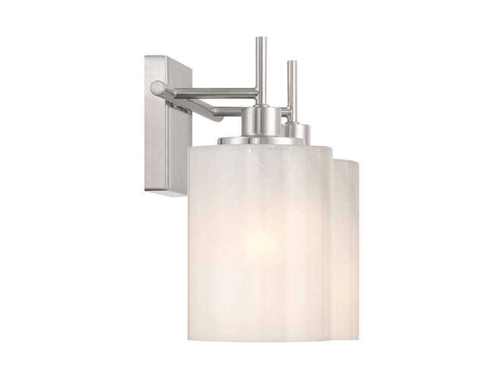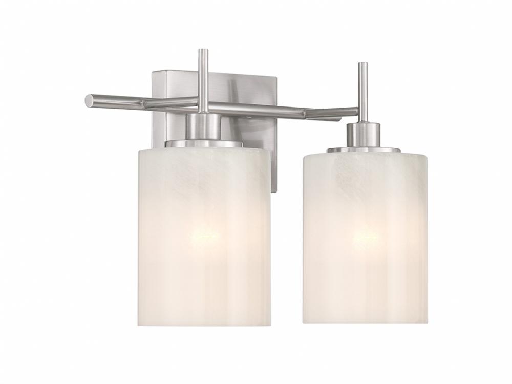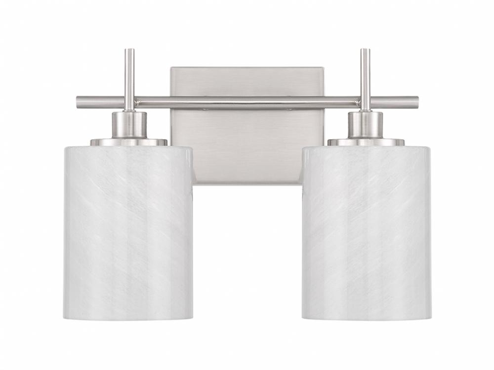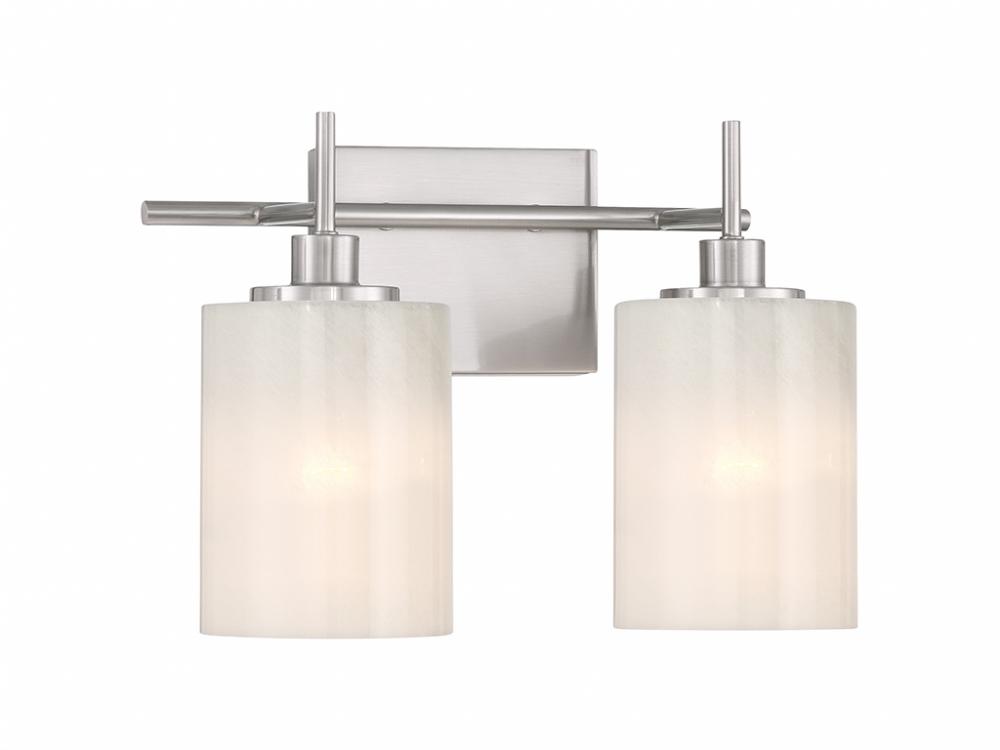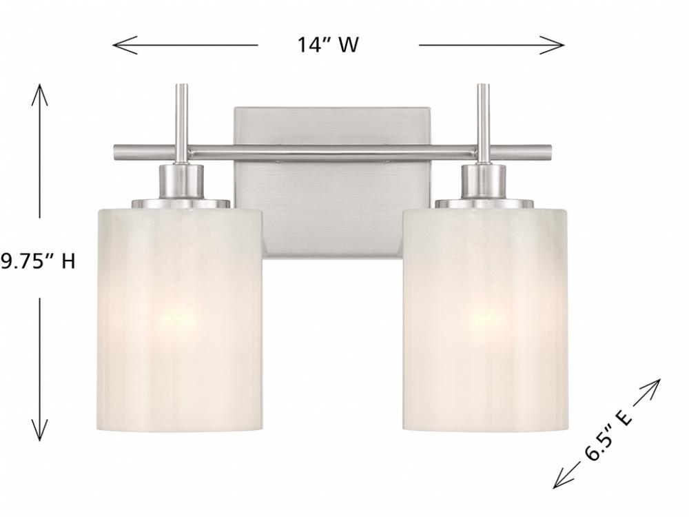 Brighten up your bath easily and beautifully with this 2-light bath bar, which showcases shades of strie glass featuring dazzling swirls that draw the eye, soften the glow and work beautifully with the Brushed Nickel finish. It is 9.75" in height, 14" in width and extends 6.5" from the wall. Uses two standard size bulbs of up to 60 watts per bulb. Bulbs not included.