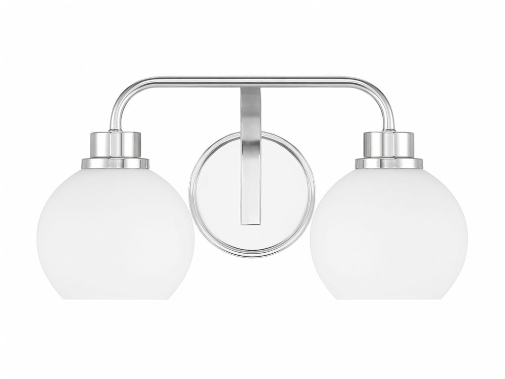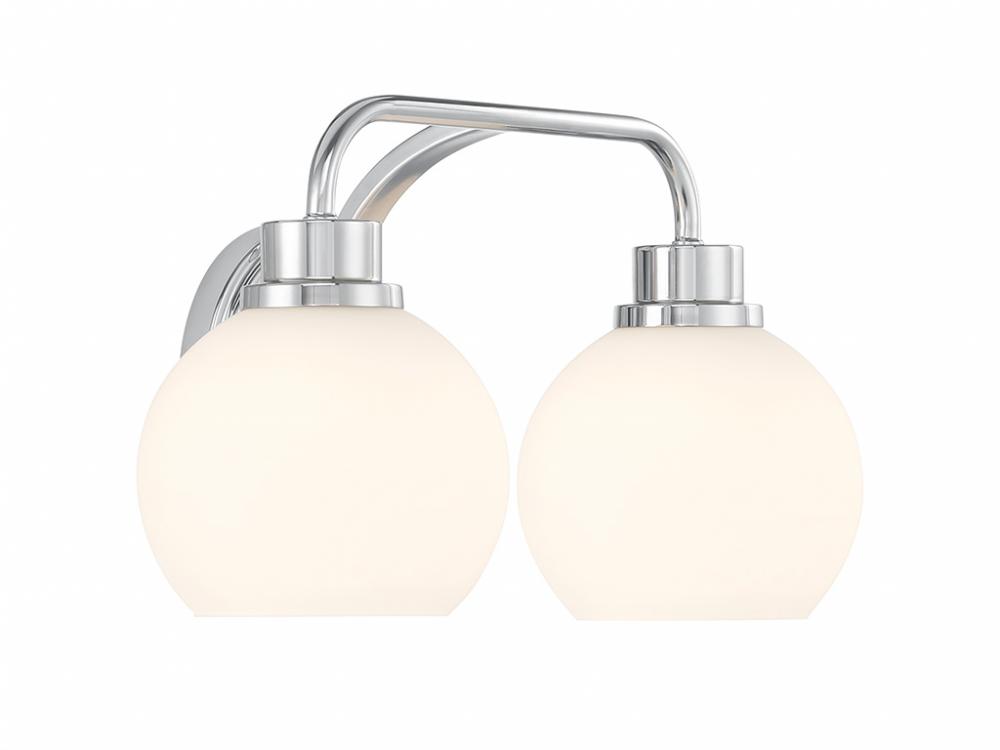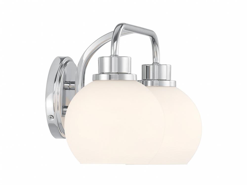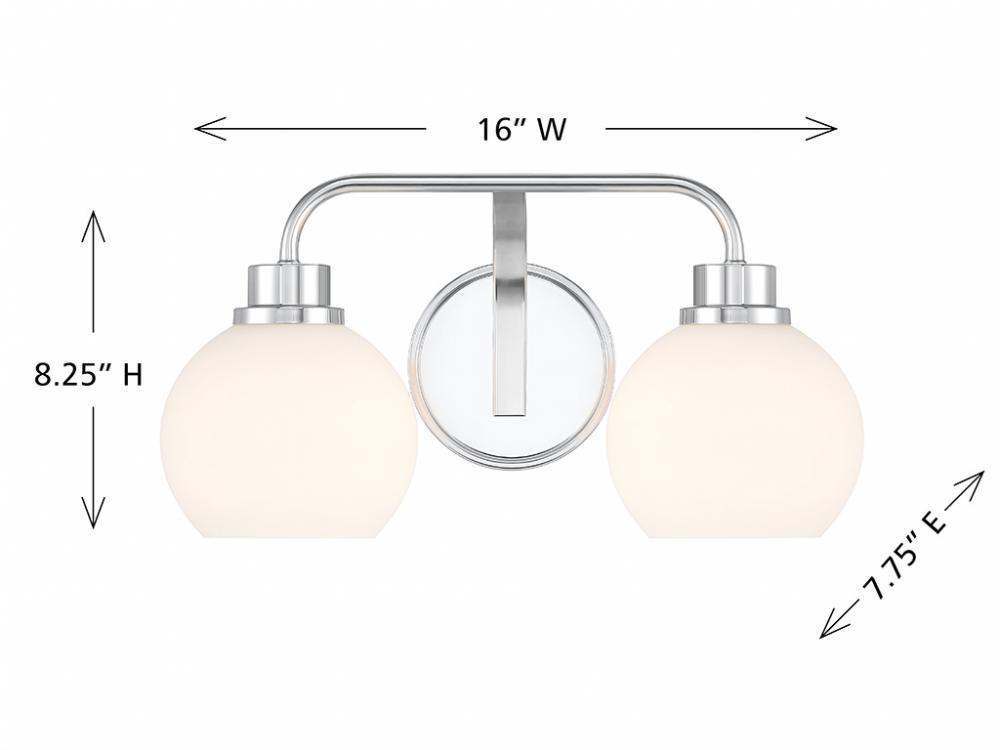 Freshen up your bathroom with the sleekly timeless style of this 2-light bath bar, which features orb-shaped shades of white opal glass that are open at the bottom and a versatile Chrome finish. It is 8.25" in height, 16" in width and extends 7.75" from the wall. It uses 2 standard size bulbs of up to 60 watts per bulb. Bulbs not included.