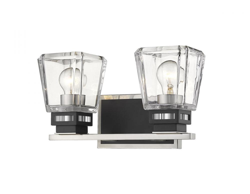 Linear design elements with elegant materials deliver a must-have look for a custom living space. Mid-Century Modern flavor stylizes this two-light vanity light, showcasing thick square glass shades mounted to a Brushed Nickel finish frame with a Matte Black surface.