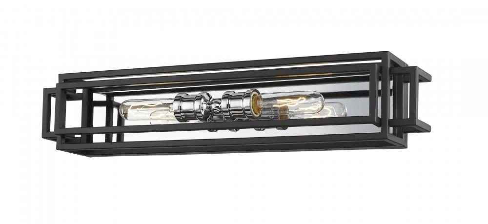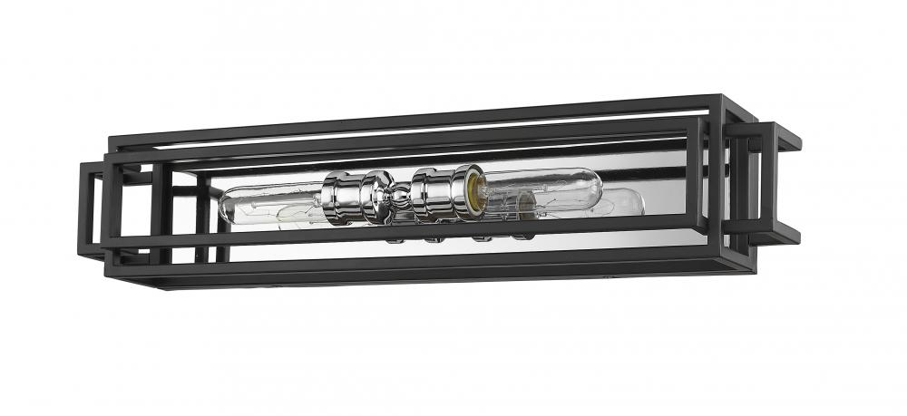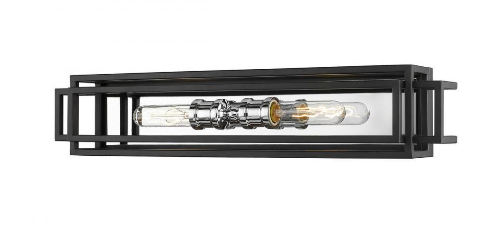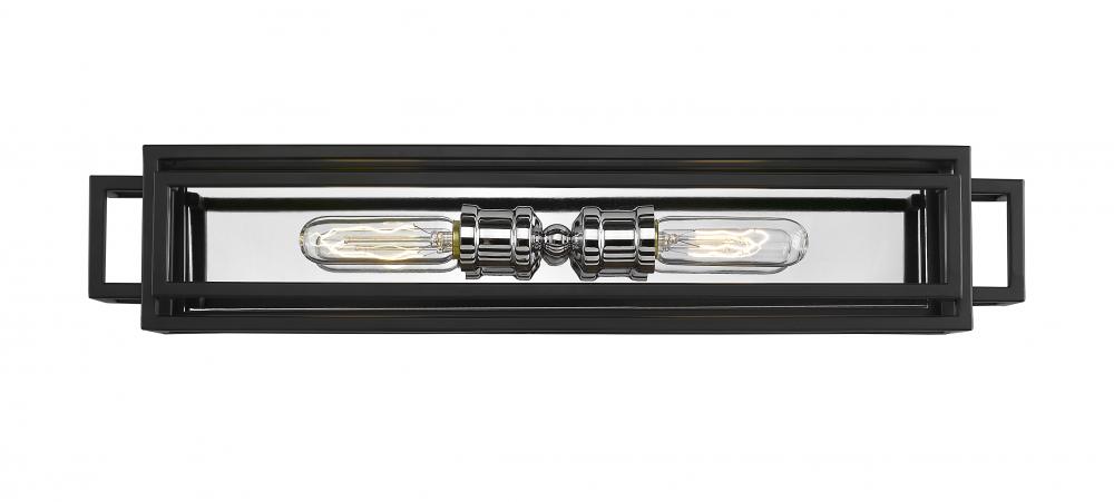 Exquisitely crafted with bold, black lines surrounding a gleaming, chrome frame, this two-light vanity will illuminate your home in style. This handsome fixture looks especially elegant when placed over a bathroom mirror.