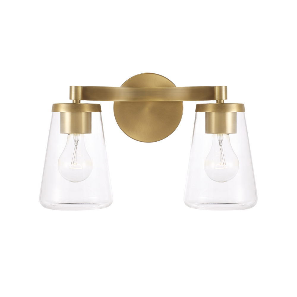 A graceful, curved arm and clear glass create the Aaron 2-Light Vanity for HomePlace. The tapered cylindrical shades bring refined style with optimal light output, while the Aged Brass finish adds elegance to the classic silhouette. Also available in a 3-Light.