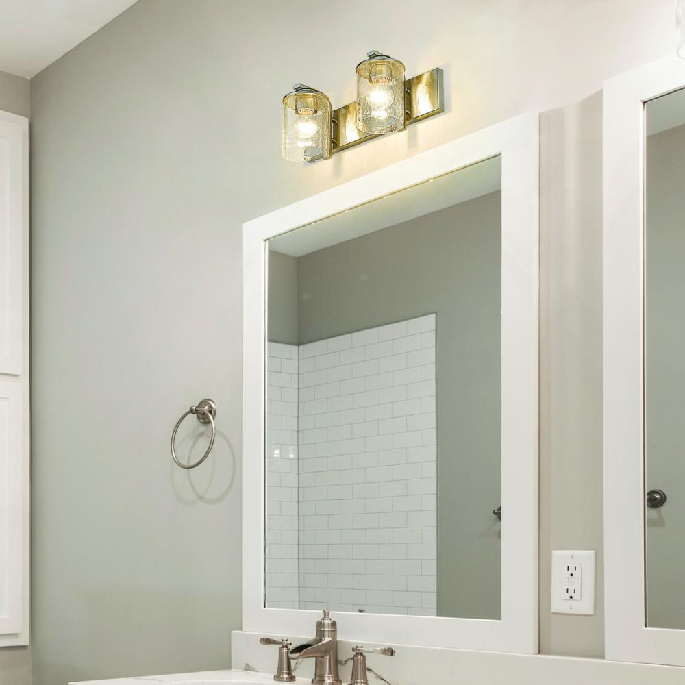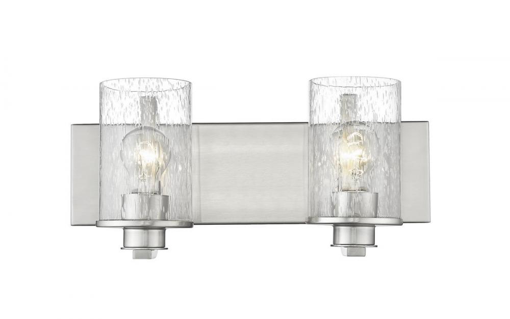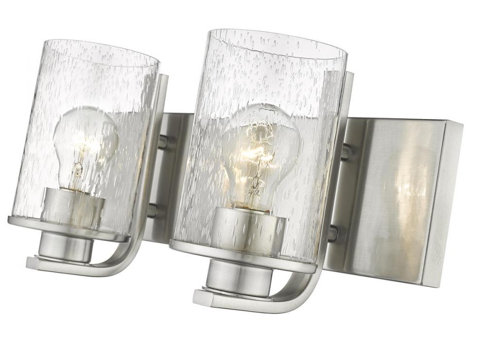 The romantic effect of clear seedy glass adds a custom design element to this contemporary two-light vanity, a great choice for illuminating modern bath and dressing spaces. Glass shades embellish the minimalist yet stylish look of steel frames and mounts made of classic brushed nickel finish steel. This two-light vanity light from the Beckett collection dresses up a compact bath space with sophistication.
