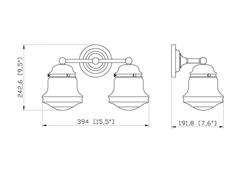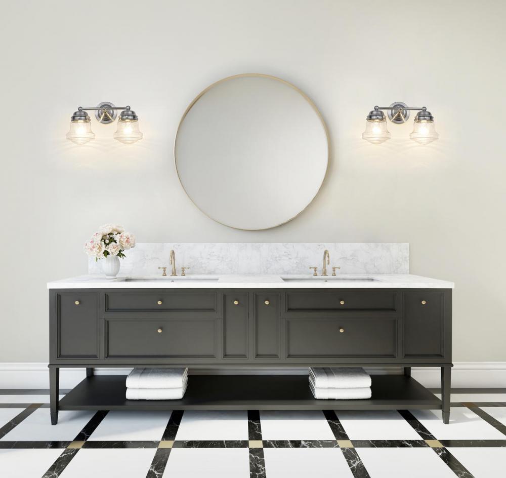 Charming, festive style goes light as it lights up a bath space with this two-light vanity from the Vaughn collection. Illuminate a compact vanity with a themed fixture borrowing from nautical and industrial, formed of cool brushed nickel finish steel and featuring unique schoolhouse clear seedy glass shades. This light becomes a central focus in a transitional or modern bathroom.