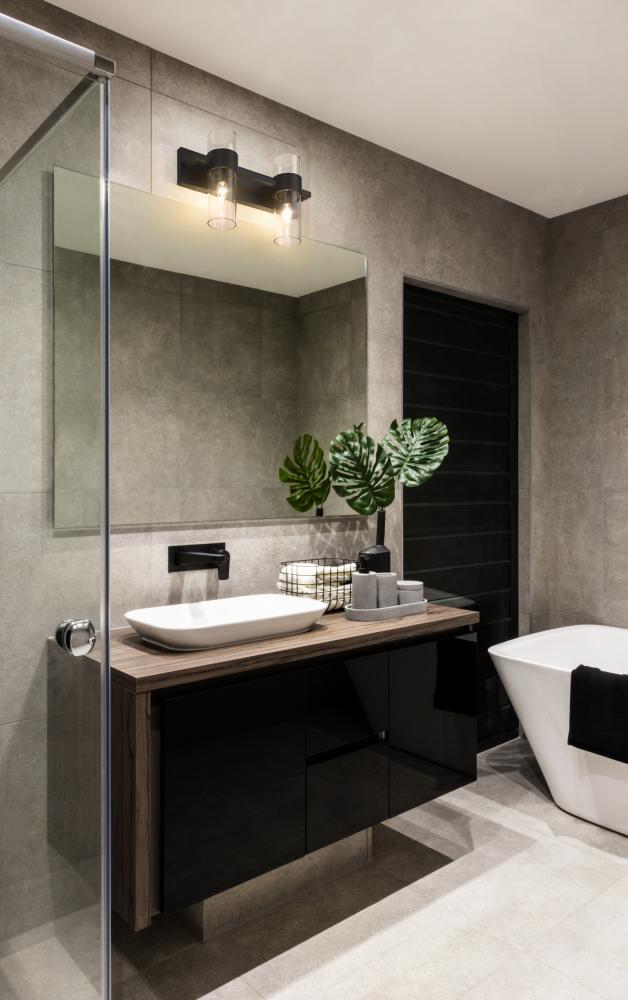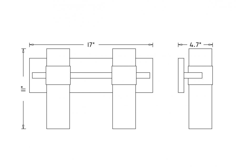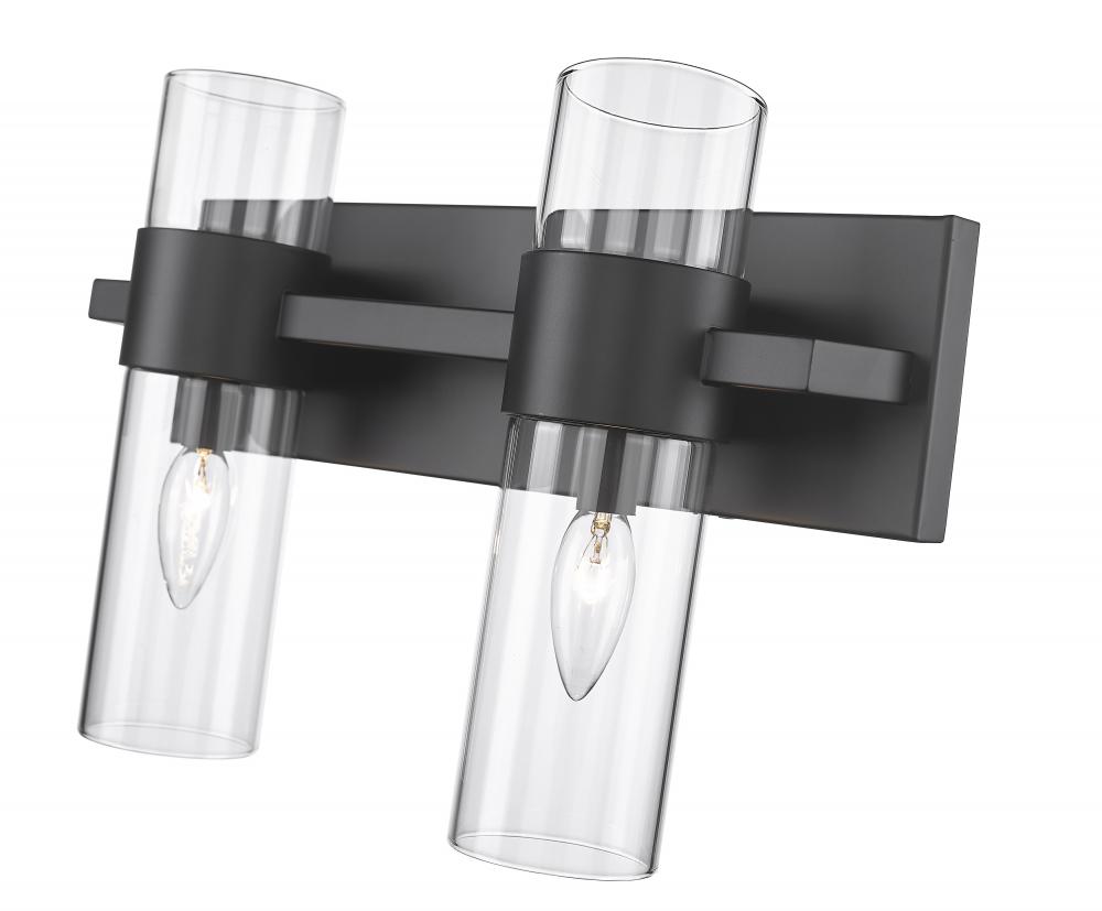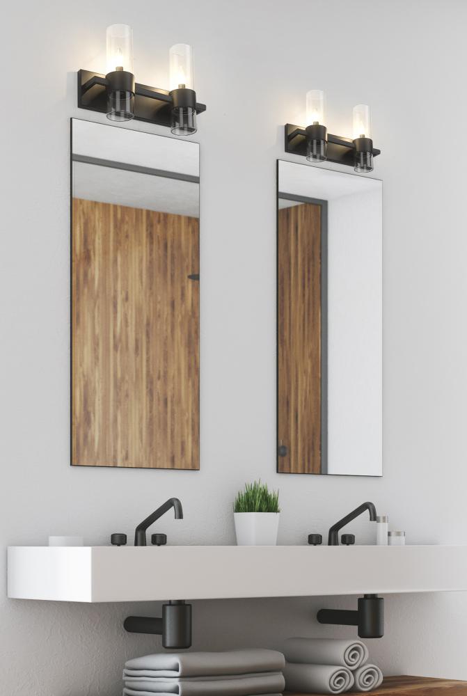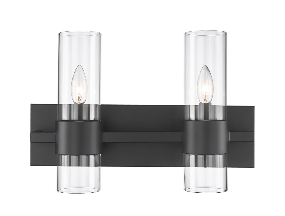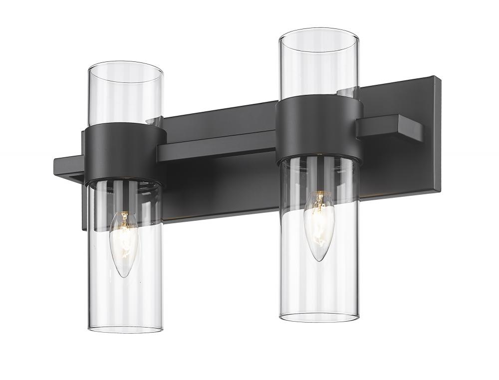 Sleek contemporary lines elevate this linear modern vanity light, illuminating bathroom countertops and powder room tablescapes with its minimalist flair. A long horizontal steel plate holds dual lights, each with a lantern-like clear glass cylinder shade clasped by a wide matte black ring, designed to add a metallic touch or complement existing bathroom hardware and fixtures. This contemporary double vanity light makes a striking addition mounted over a decorative mirror, providing ample glow and chic style to the space.