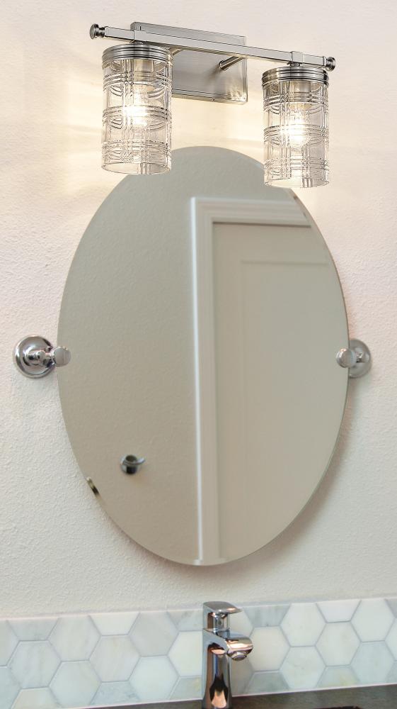 Adorn a traditional-leaning bathroom countertop vanity with this sophisticated, classically designed transitional two-light vanity wall sconce. With an old-world restoration flair, two cut crystal-inspired glass shades present a handsome Glen plaid pattern, creating a scintillated effect across countertops and walls. A shiny brushed nickel plate and caps complement cool tone metal fixtures and hardware, lending a timeless look to this metropolitan two-light vanity wall sconce, transforming bathroom interiors.
