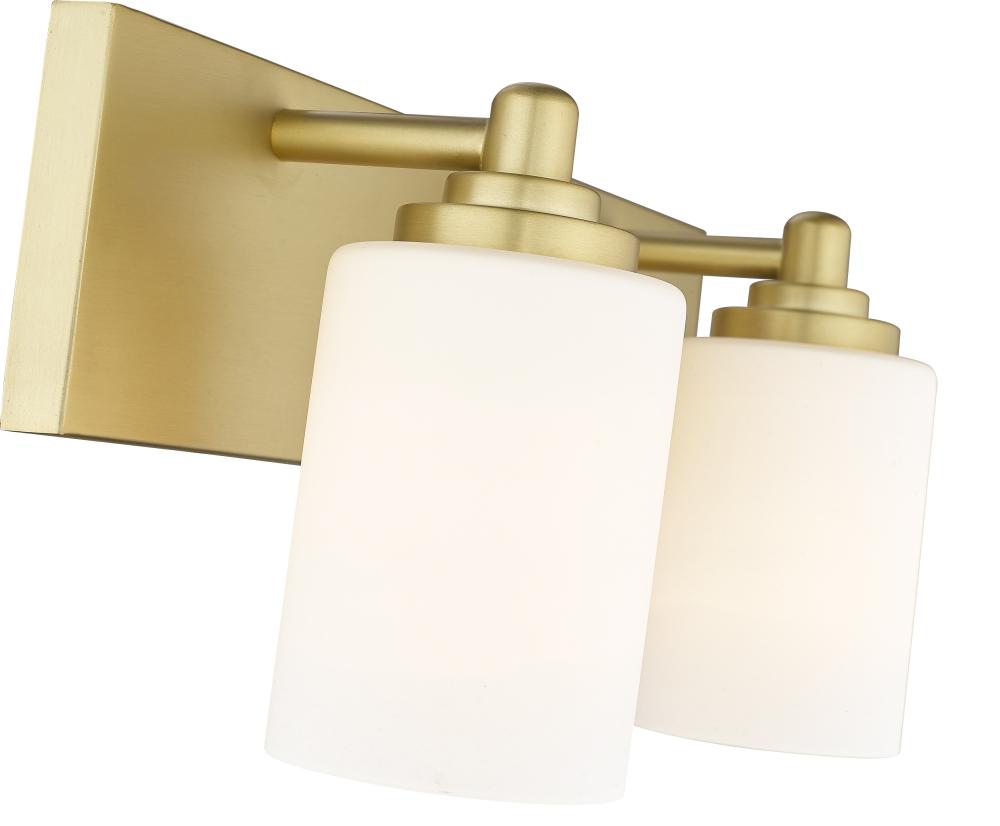 Double the accent lighting to embellish soft lighting from a two-light vanity light intended for impact. This fixture from the Soledad collection offers a minimalist silhouette with brushed gold finish steel serving as a rectangular wall plate and holder, and side-by-side chic cylinder shades made of delicate white glass. This fixture may be mounted facing up or down in an en suite or guest bathroom or hallway.