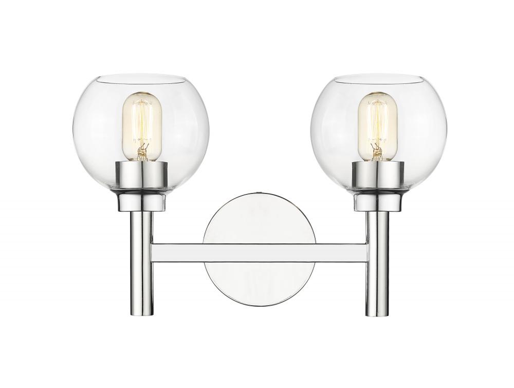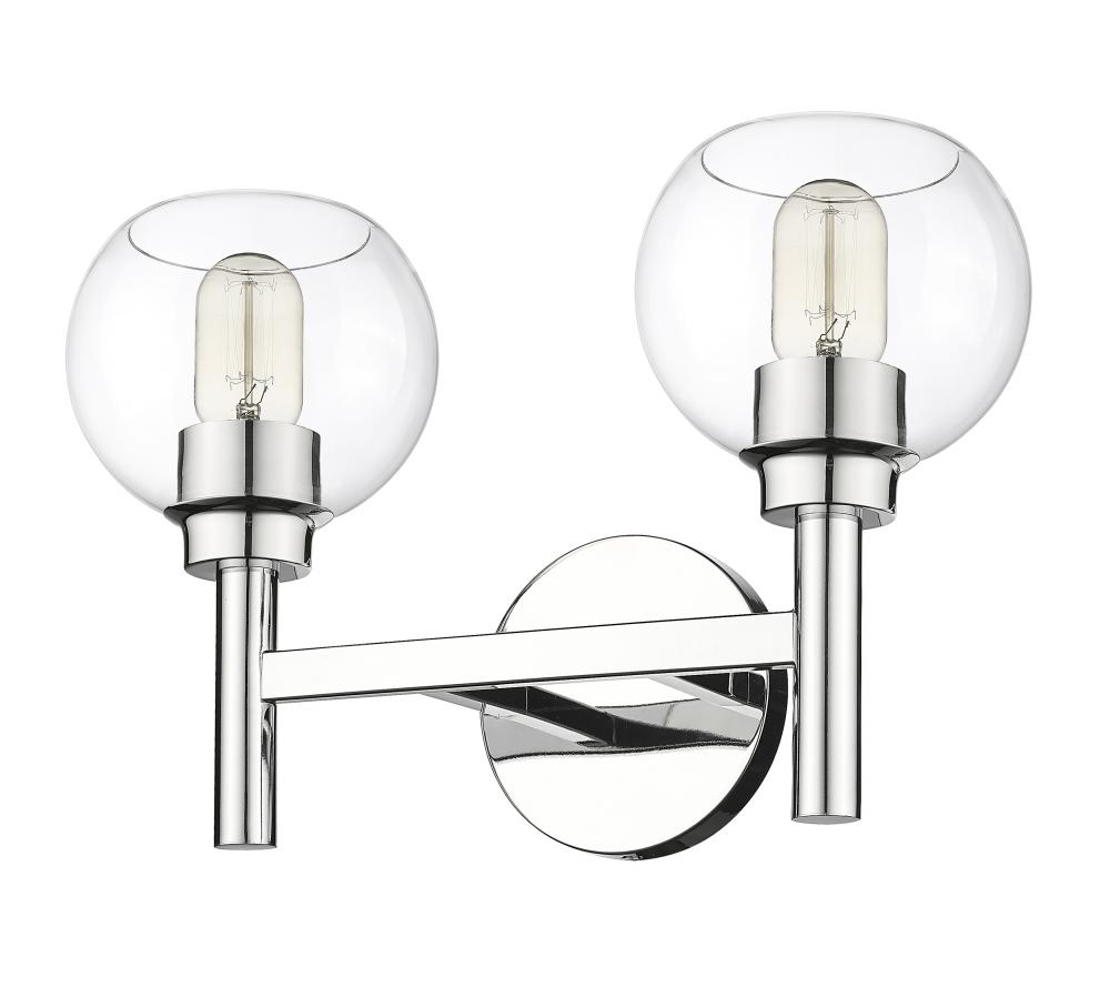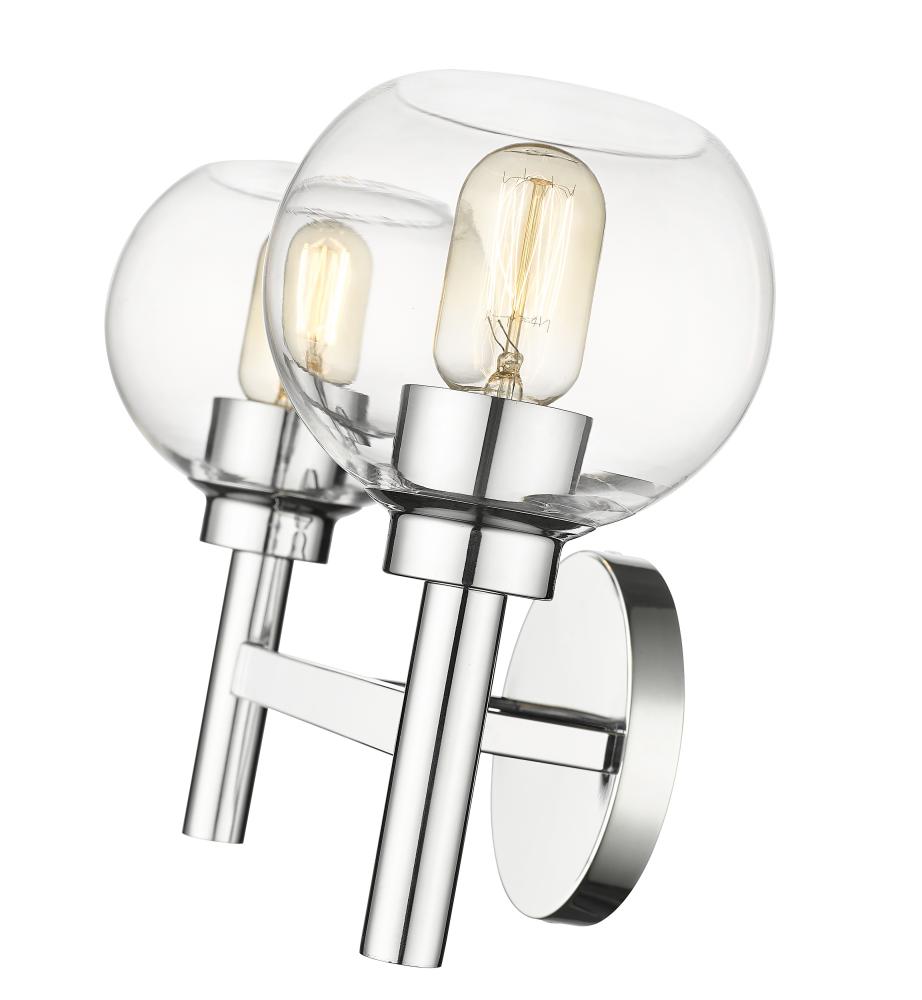 A contemporary two-light vanity sconce boasts graceful curves that create its perfect circle design elements. Its familiar, torch-inspired silhouette is adorned with a chrome finish for polished flair in an entry or bathroom. A pair of open-edged, clear glass globe shades adds precision, and this fixture can be mounted with lights either up or down to best suit your space and preference.