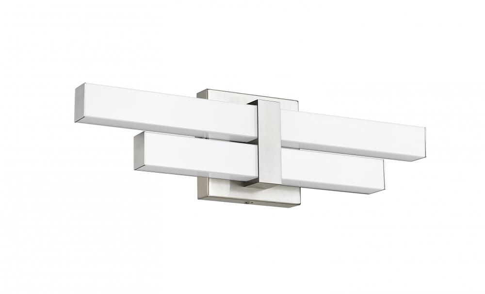 Geometry and minimalism play well together in the crisp, modern design of this two-light vanity light, an intriguing way to illuminate a bath space with compatible contemporary elements. Symmetry and balance collude in a fixture created of brushed nickel finish aluminum and a pair of bar diffusers forming a tapered silhouette, creating dimmable ambient lighting with customized white color values.