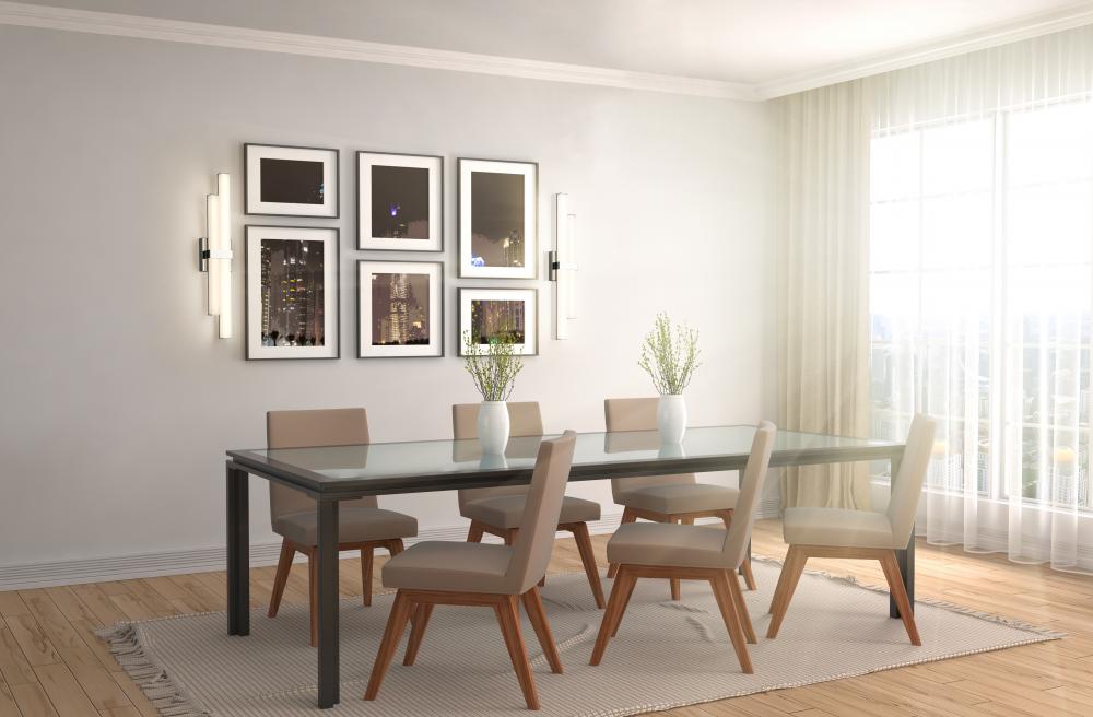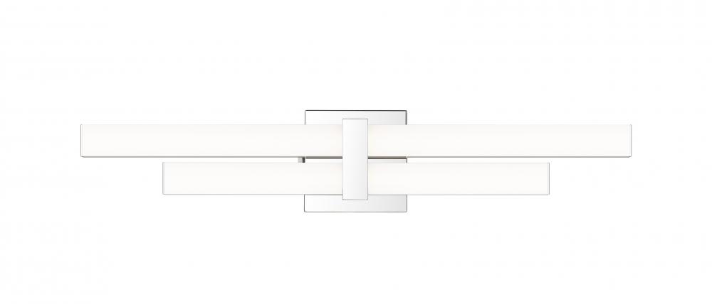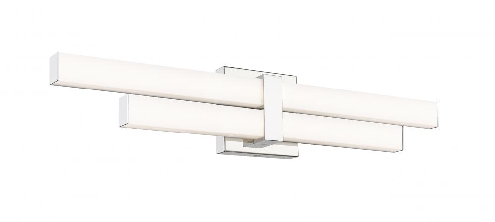 Minimalism turns striking and full of personality as this contemporary two-light vanity light takes shape in a custom bathroom. Aluminum framing and accents offer a chrome finish, as graduated frosted bar diffusers align vertically to emit dimmable LED lighting with a customized option of white color values.
