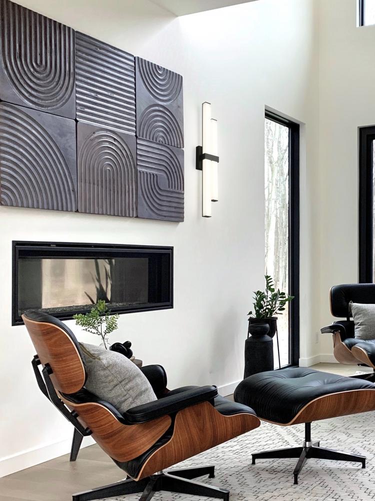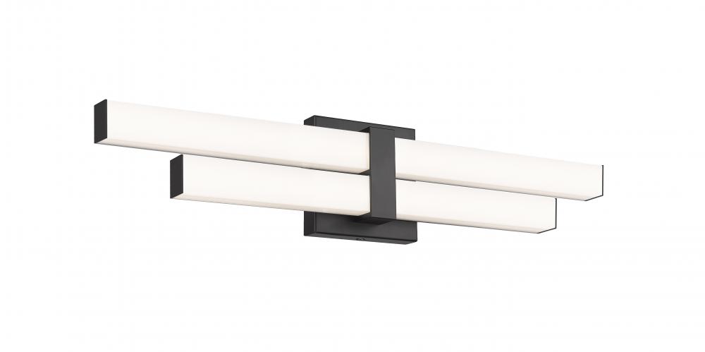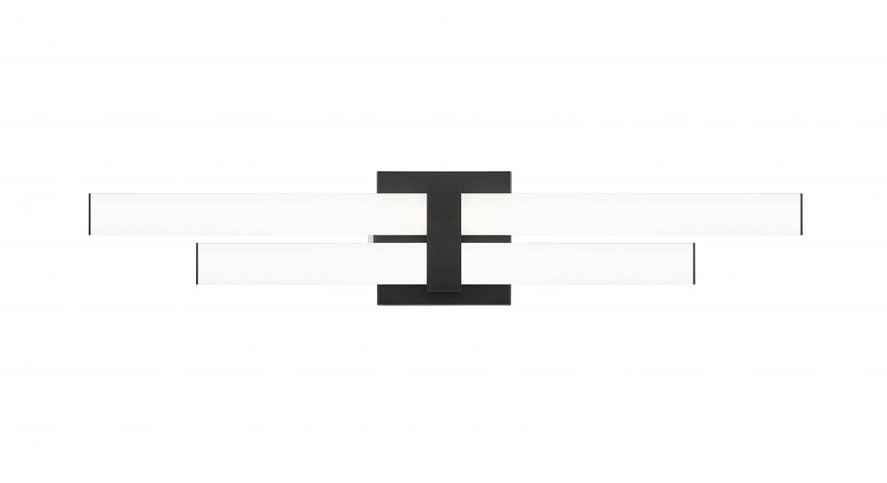 The design power of contrast plays a key role in this updated two-light vanity light. Aluminum framing and accents offer a dynamic matte black finish, as graduated frosted bar diffusers align vertically to emit dimmable LED lighting with a customized option of white color values.