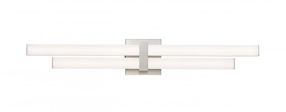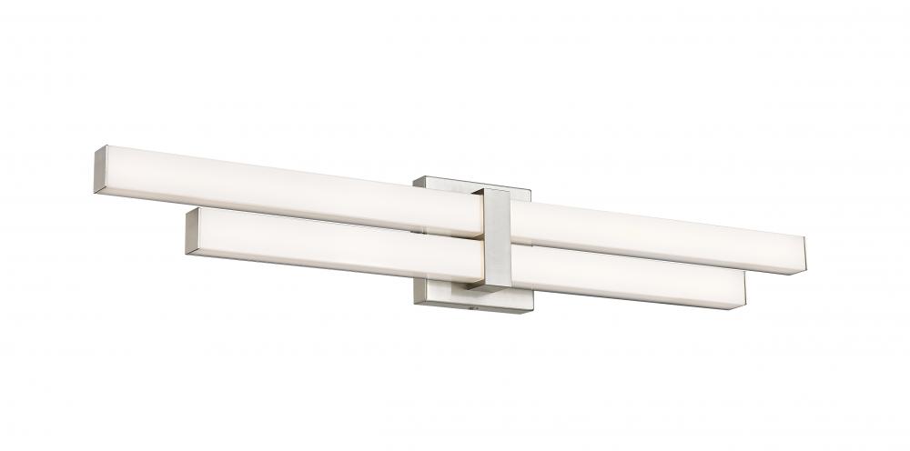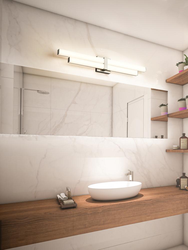 The Zane family of vanity lights is comprised of an asymmetrical stacked design that provides ample light and plenty of style. The choice of 18-, 25-, 32-, and 40-inch widths ensures that Zane will suit the most popular vanity sizes. Lamped with dimmable m