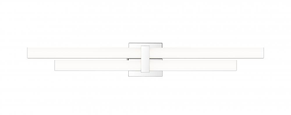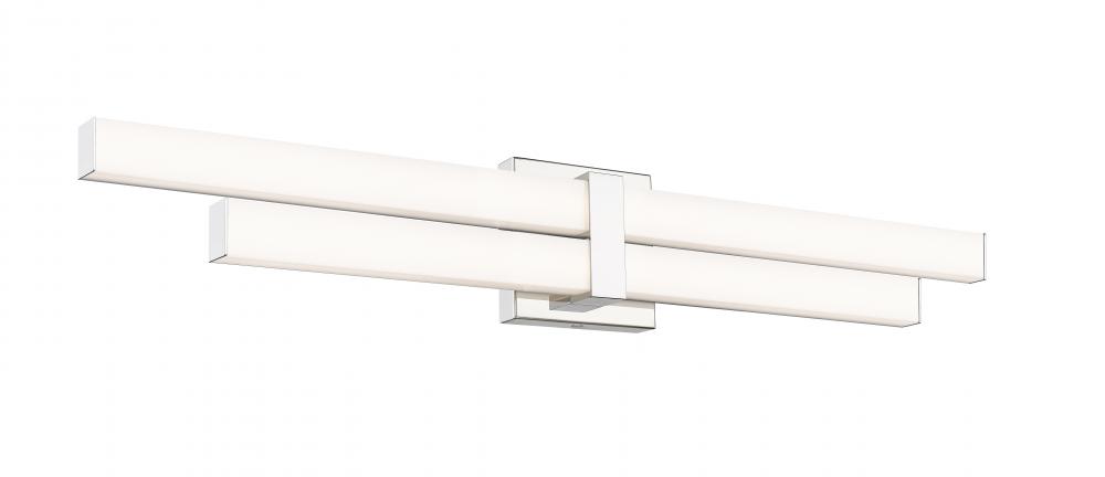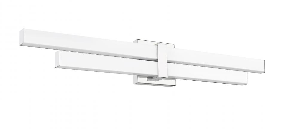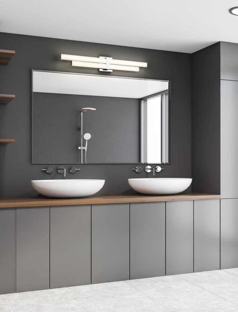 Optically captivating structural silhouetting shows off contemporary vibes in a modern two-light vanity light perfect for custom bath spaces. Aluminum framing and accents offer a cool chrome finish, as graduated frosted bar diffusers align vertically to emit dimmable LED lighting with a customized option of white color values.